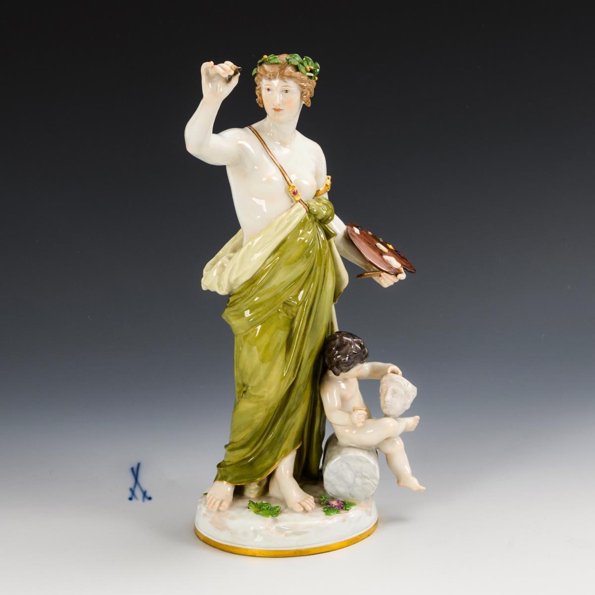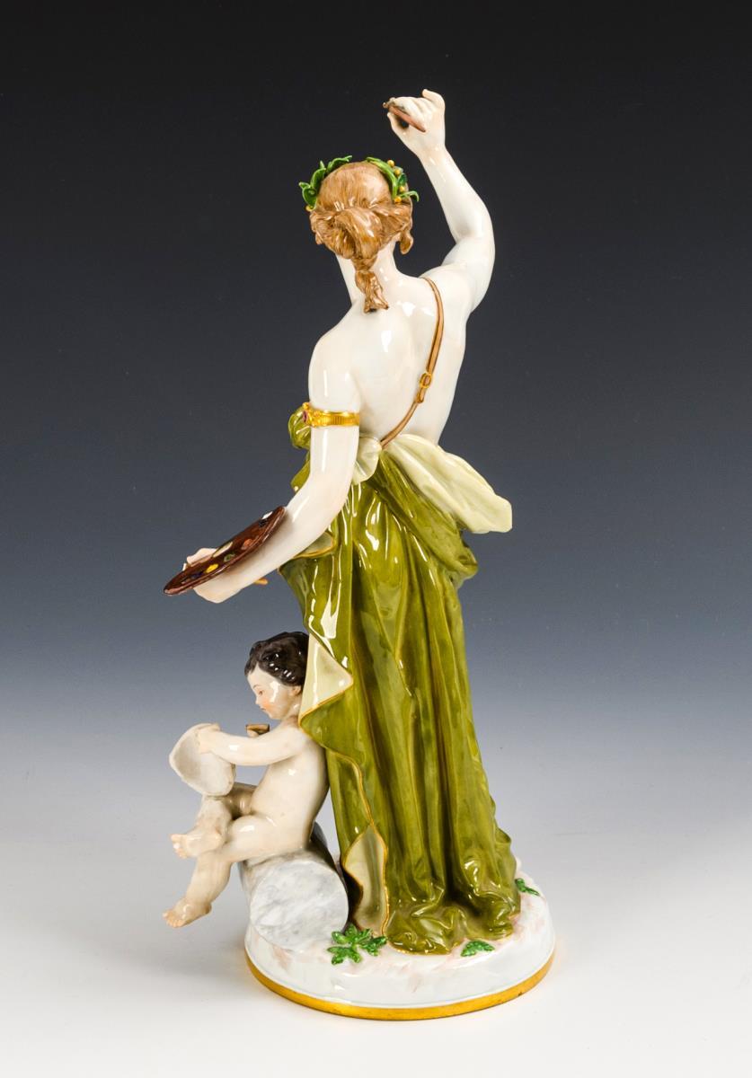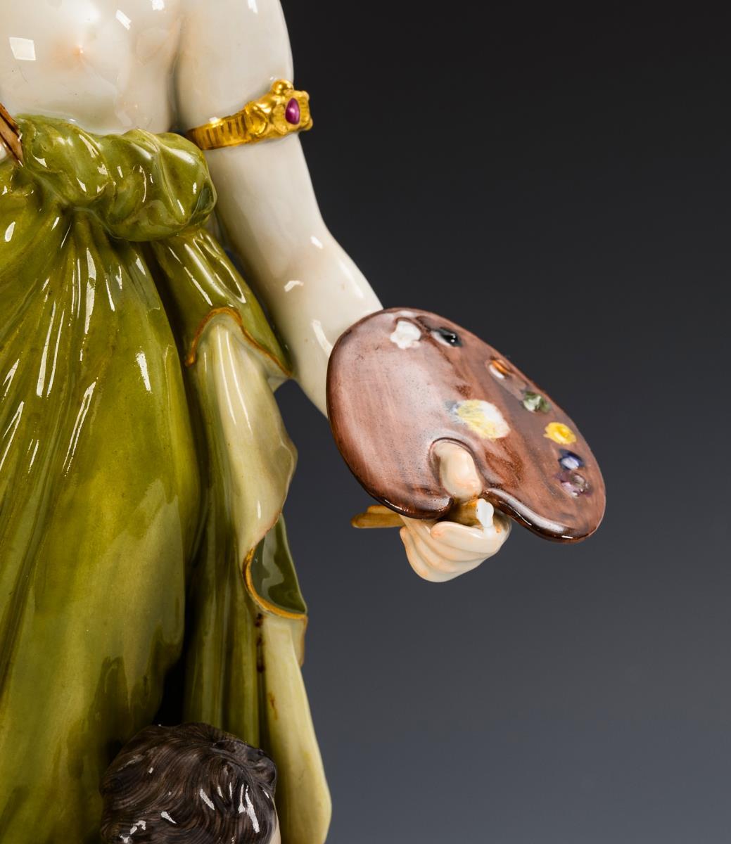 A female allegory of painting standing on a round base with brush and palette, a putto with mask seated at her feet. All brushes and 2 leaves chipped at the laurel hair decoration.