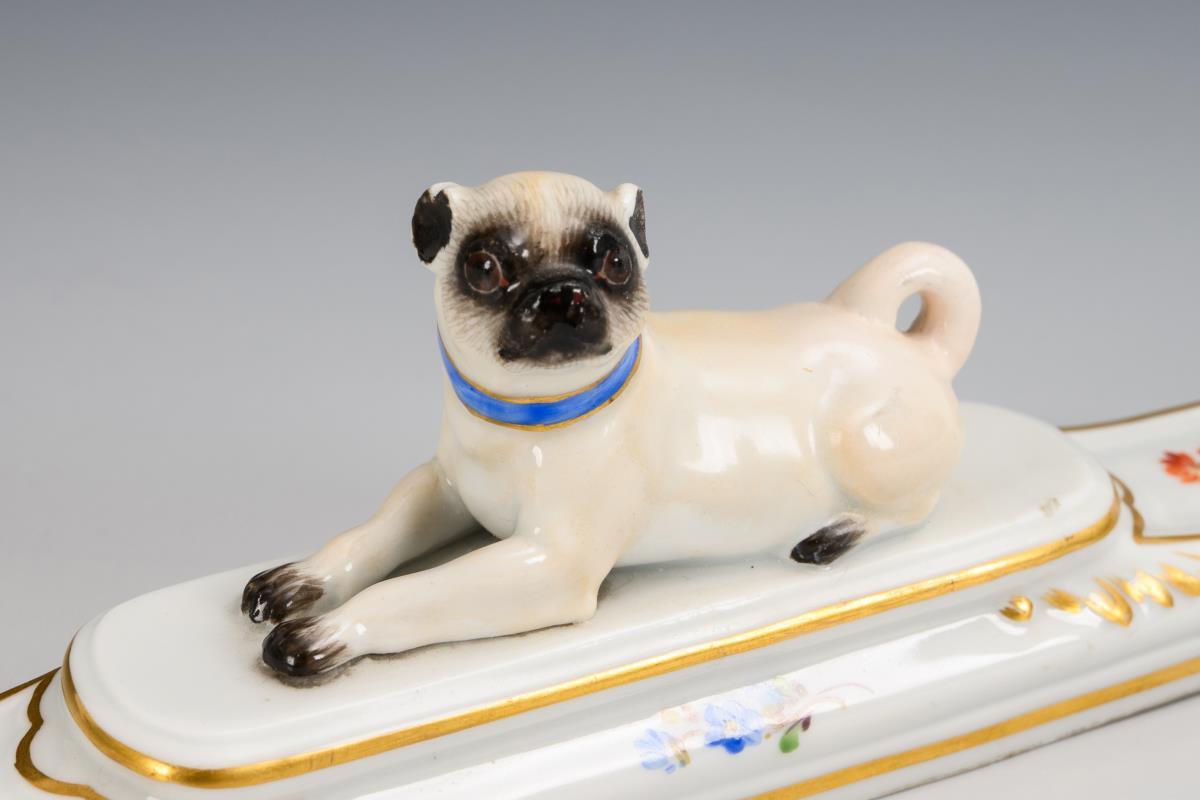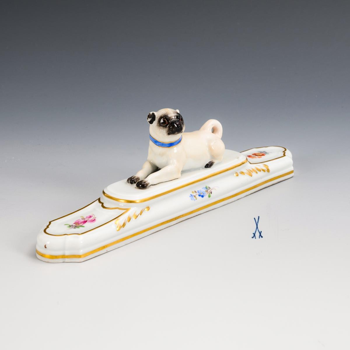 Elongated base with the sculpture of a lying pug. Minimal wear to the right ear.