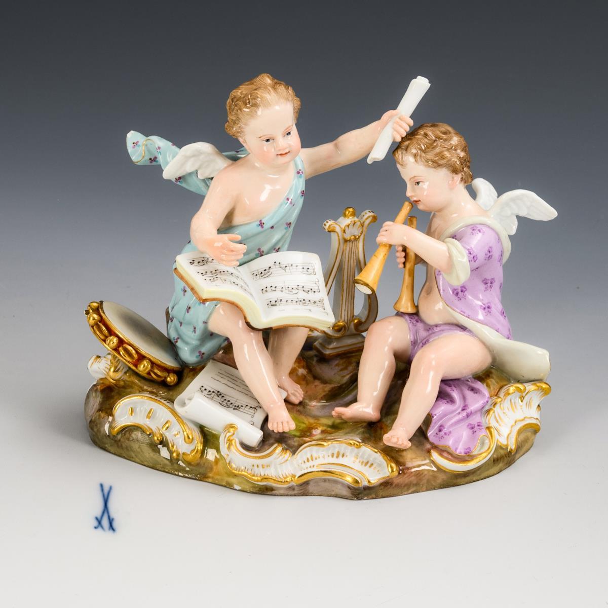 Putti couple playing music with music book and instruments on a natural rocaille base. Minimal wear to the edge of the base, shawm and 1 hand restored.