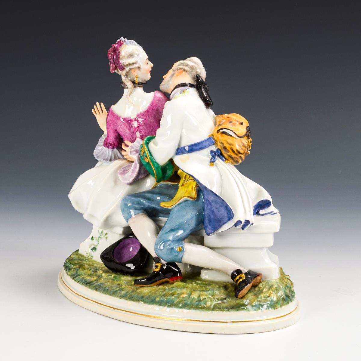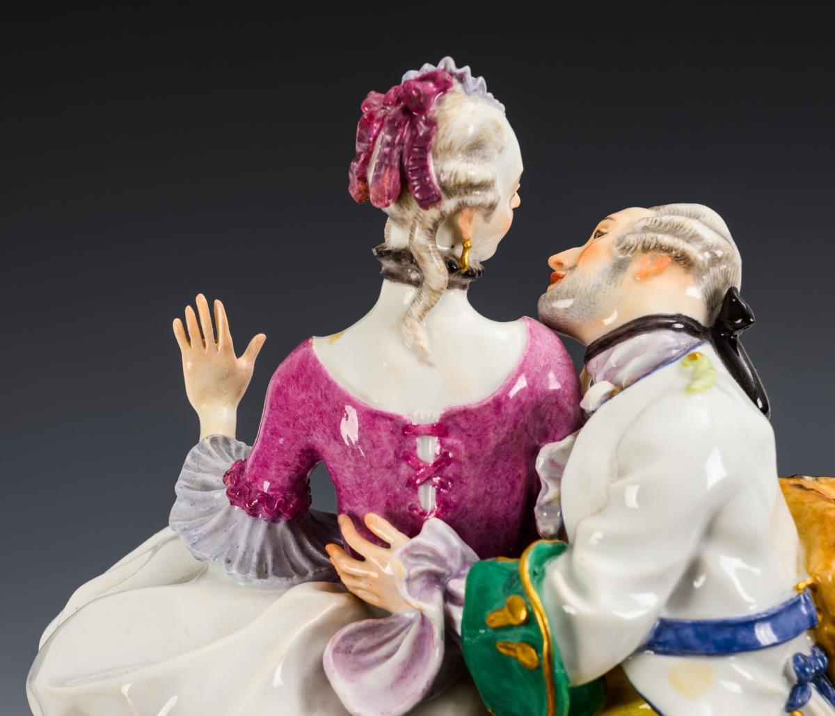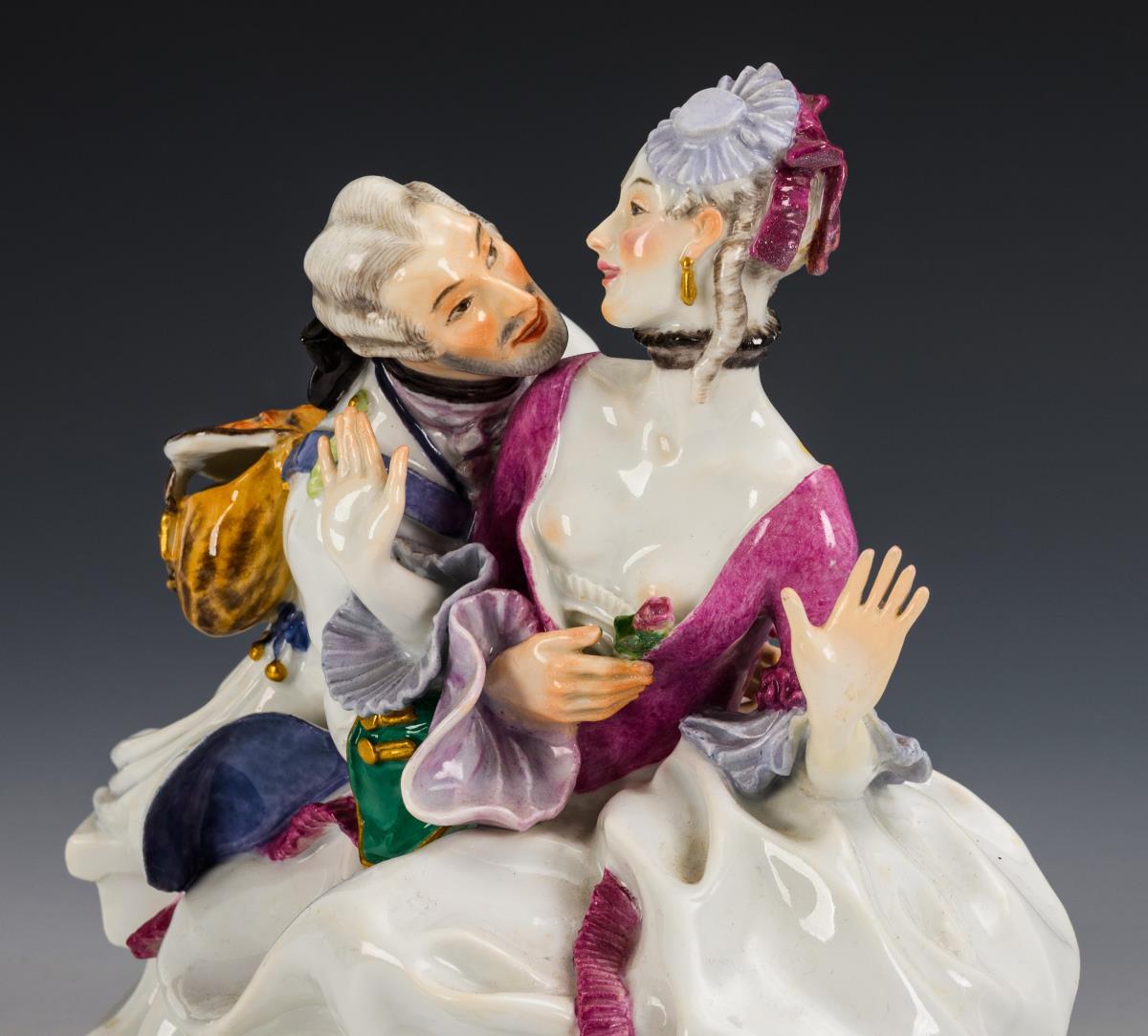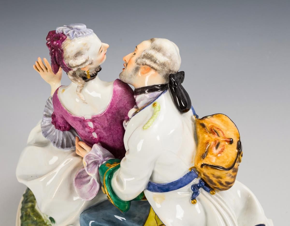 Also "Approach". Gallant group of a hunter approaching a rococo lady. Left hand of the lady and 1 rose petal restored.