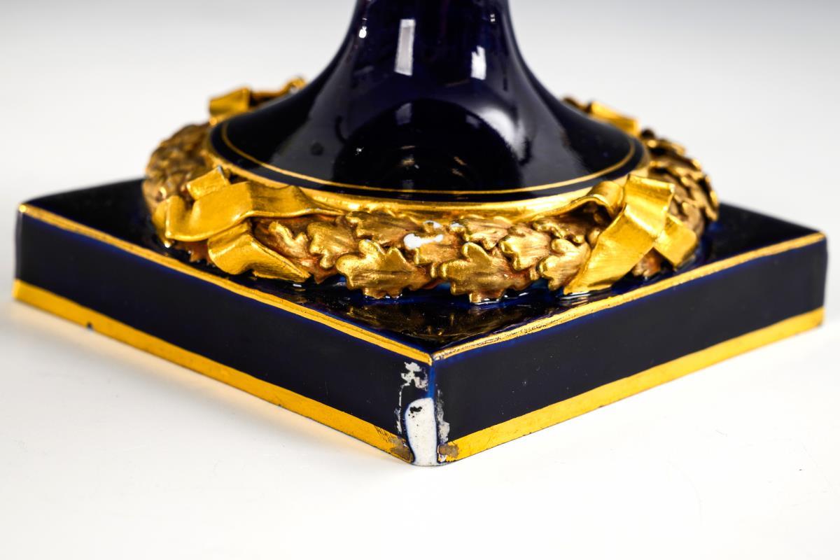 Cobalt blue ground, polychrome painting, gold staffage. H 28 cm.
