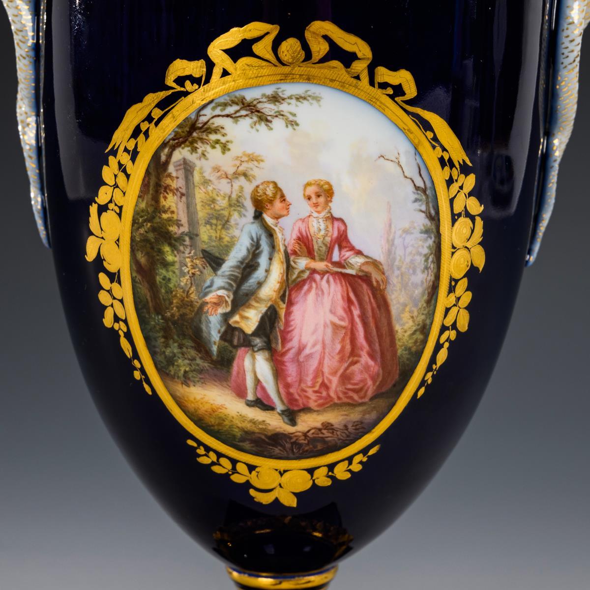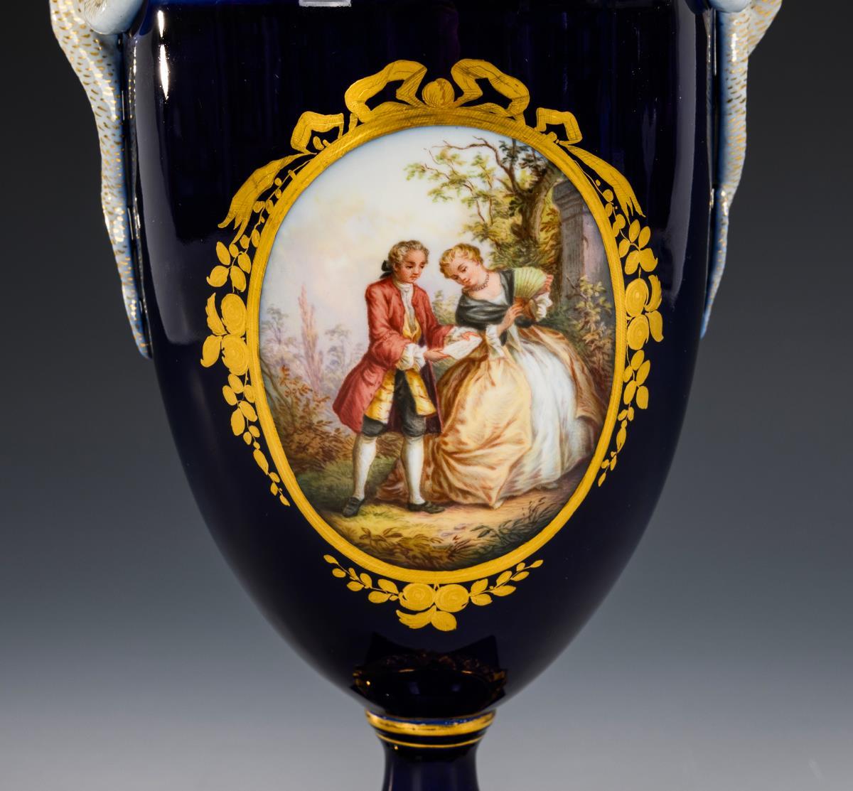 Ovoid body with two snake handles, pierced lid with oak leaf handle and round foot; with inverted oak leaf wreath and square plinth. Cobalt ground, on both sides an oval medallion with gallant couples in a park landscape. Bands of the oak leaf wreath on the lid partly bumped, 2 corners of the base bumped.