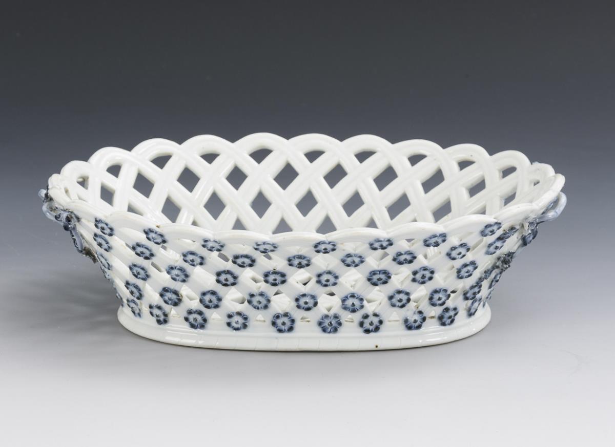 Oval basket with applied forget-me-not blossoms. Some chips to the blossoms, flower stems restored.