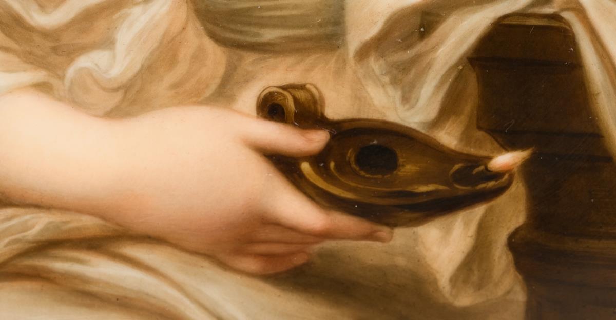 Oval panel depicting a young woman dressed in antique style with an oil lamp, after the painting by Angelika Kauffmann (1741-1807).