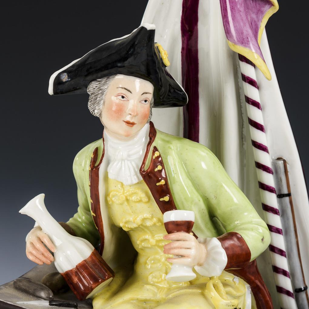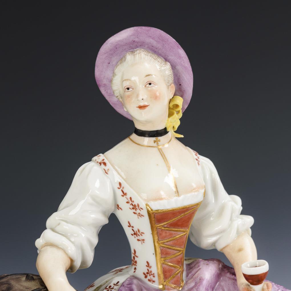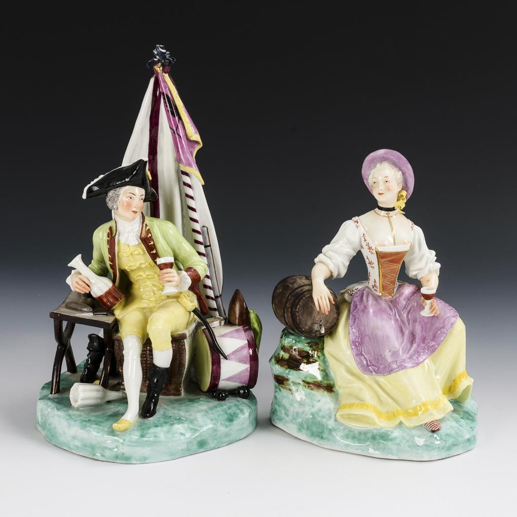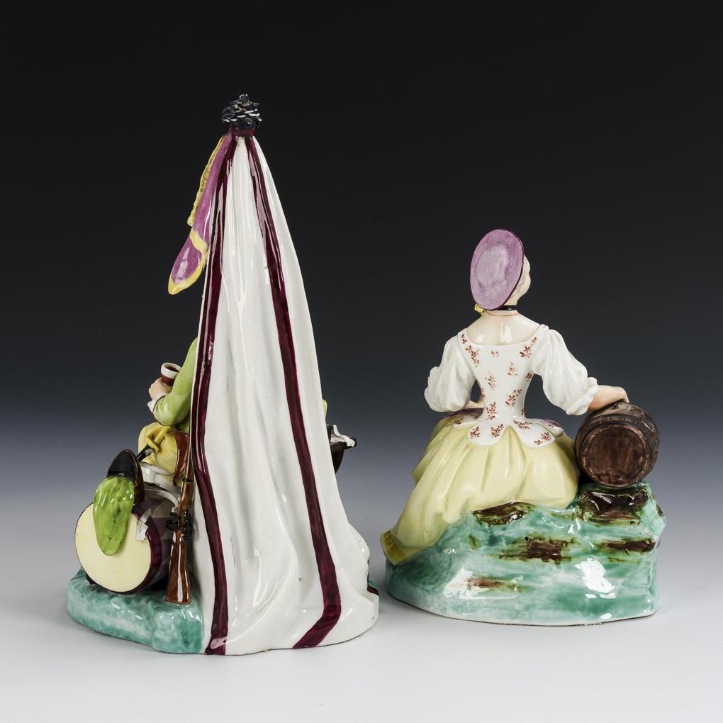 1x Soldier sitting in front of a tent at a table with wine bottle and wine glass, at his left a drum as well as the rifle. / 1x young woman sitting at a wine barrel with a wine glass.