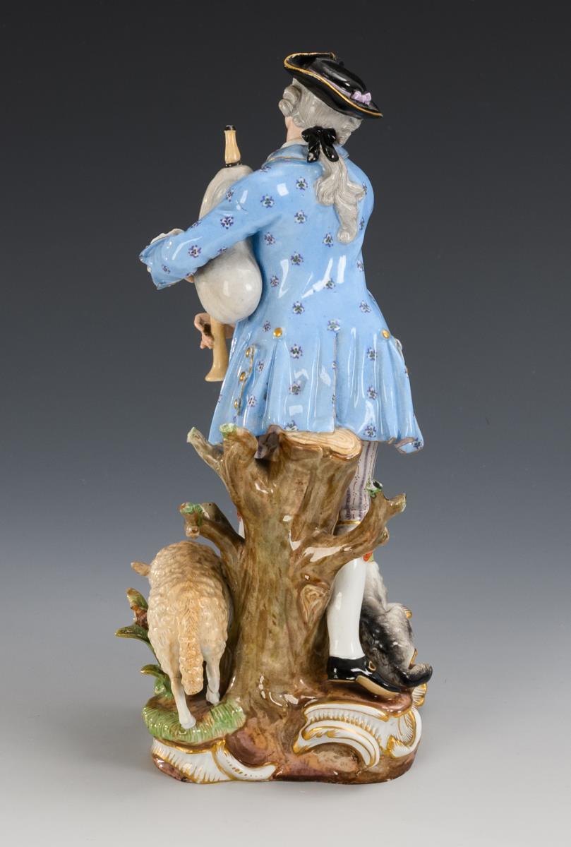 A shepherd playing a bagpipe standing on a natural and rocaille base, a sheep and a dog at his feet. Left sheep's ear bumped, leaves missing, hairline crack in the sheep's right hind leg.