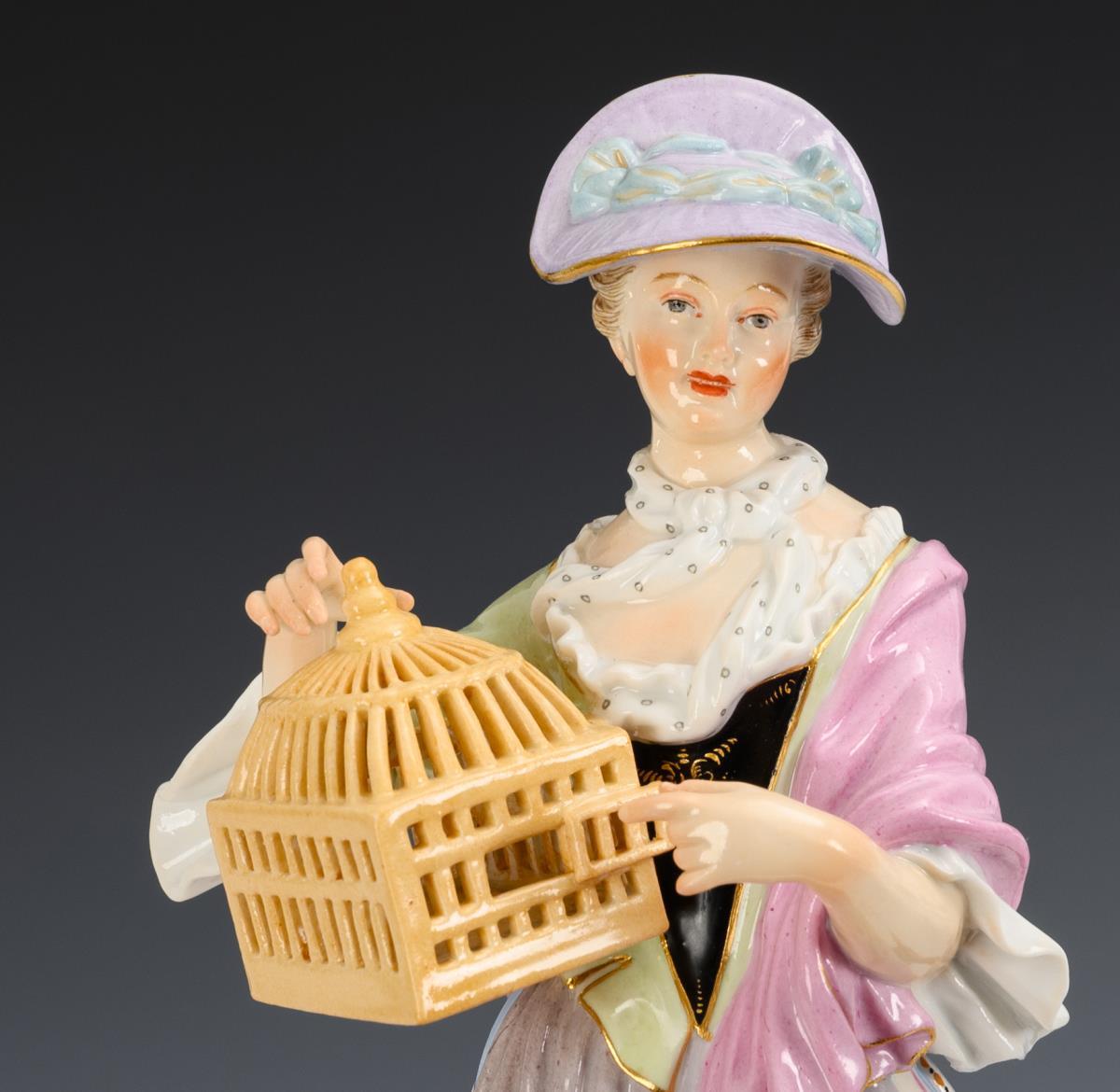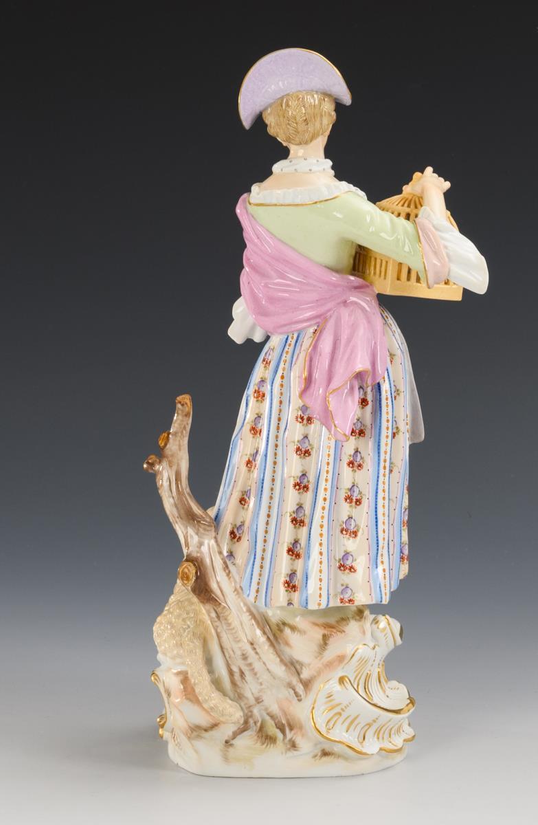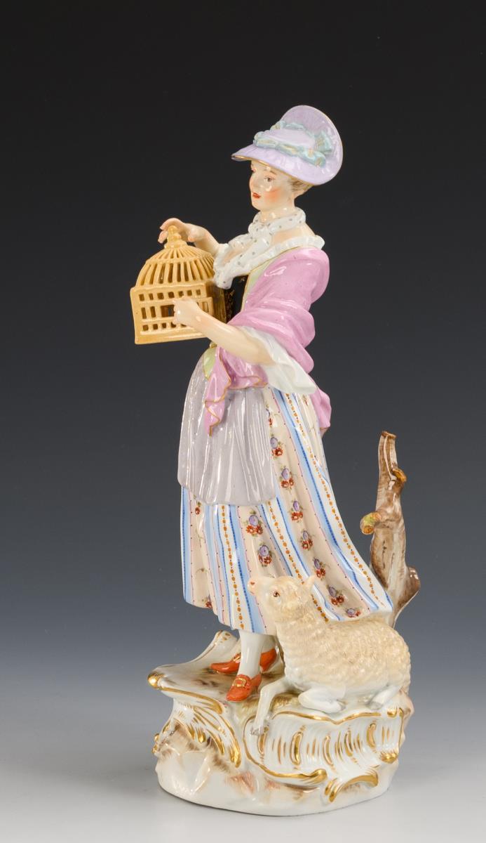 Shepherdess with birdcage standing on a natural and rocaille base, with a sheep lying at her feet. Right sheep's leg and ear and partially restored tree trunk.