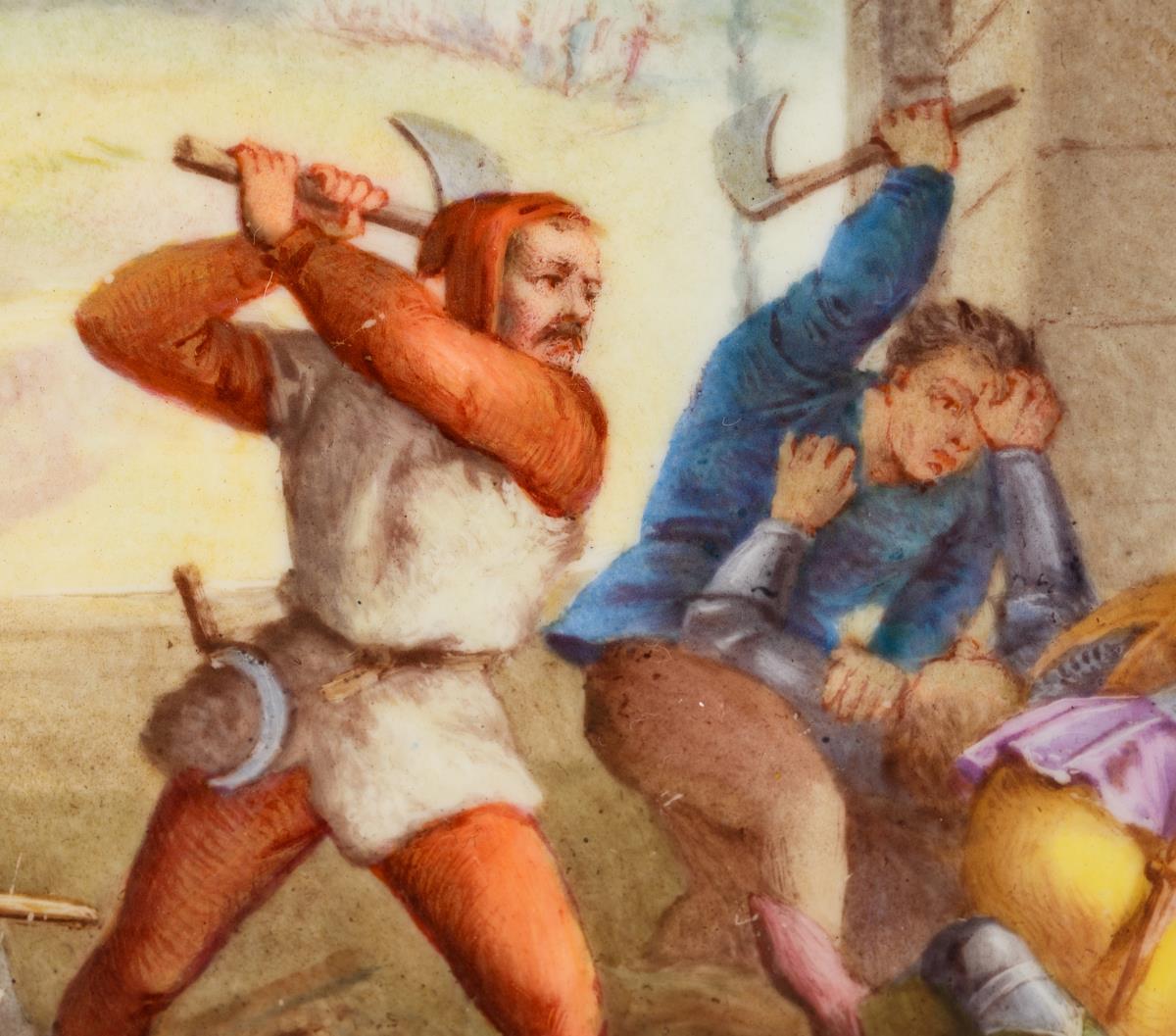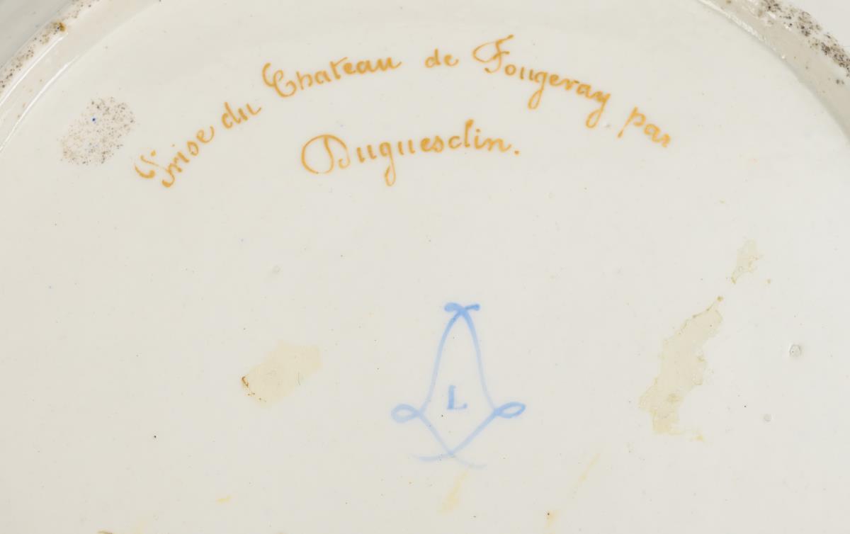 Multi-pass plate. Cobalt rim with ornamental gold and enamel painting, the mirror depicting a battle, inscribed on the underside "prise de chateau de Fougerag par Duguesclin" (capture of Fougères Castle by Duguesclin).