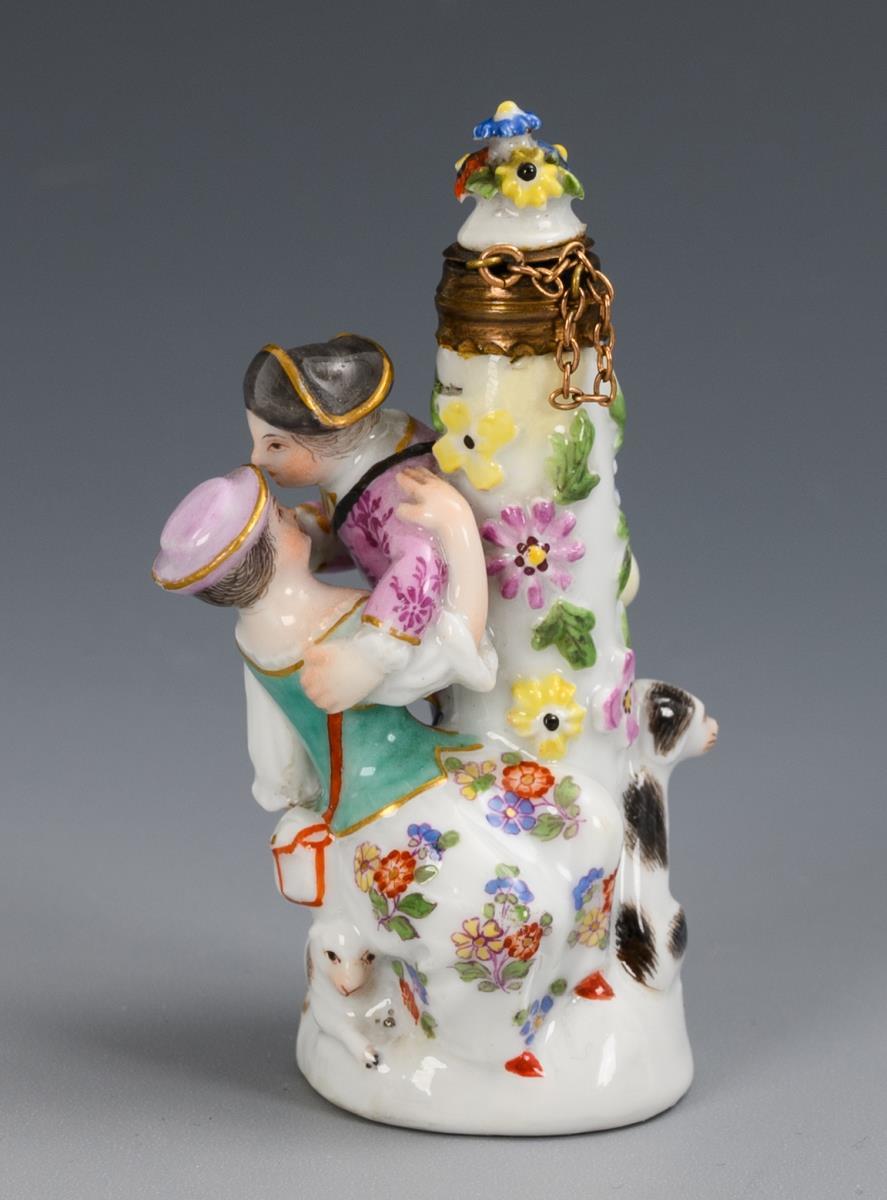 A pair of kissing shepherds standing on a flower-covered column as a flacon. Flacon with stopper. Minimal wear to the shepherd's hat, left foot of the shepherd, sheep's leg and tail restored.