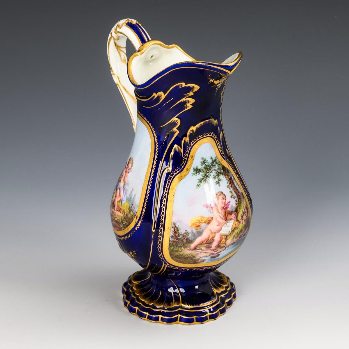 Pear jug with acanthus leaf handle and multipass foot. Cobalt ground, three cartouches with depictions of putti.