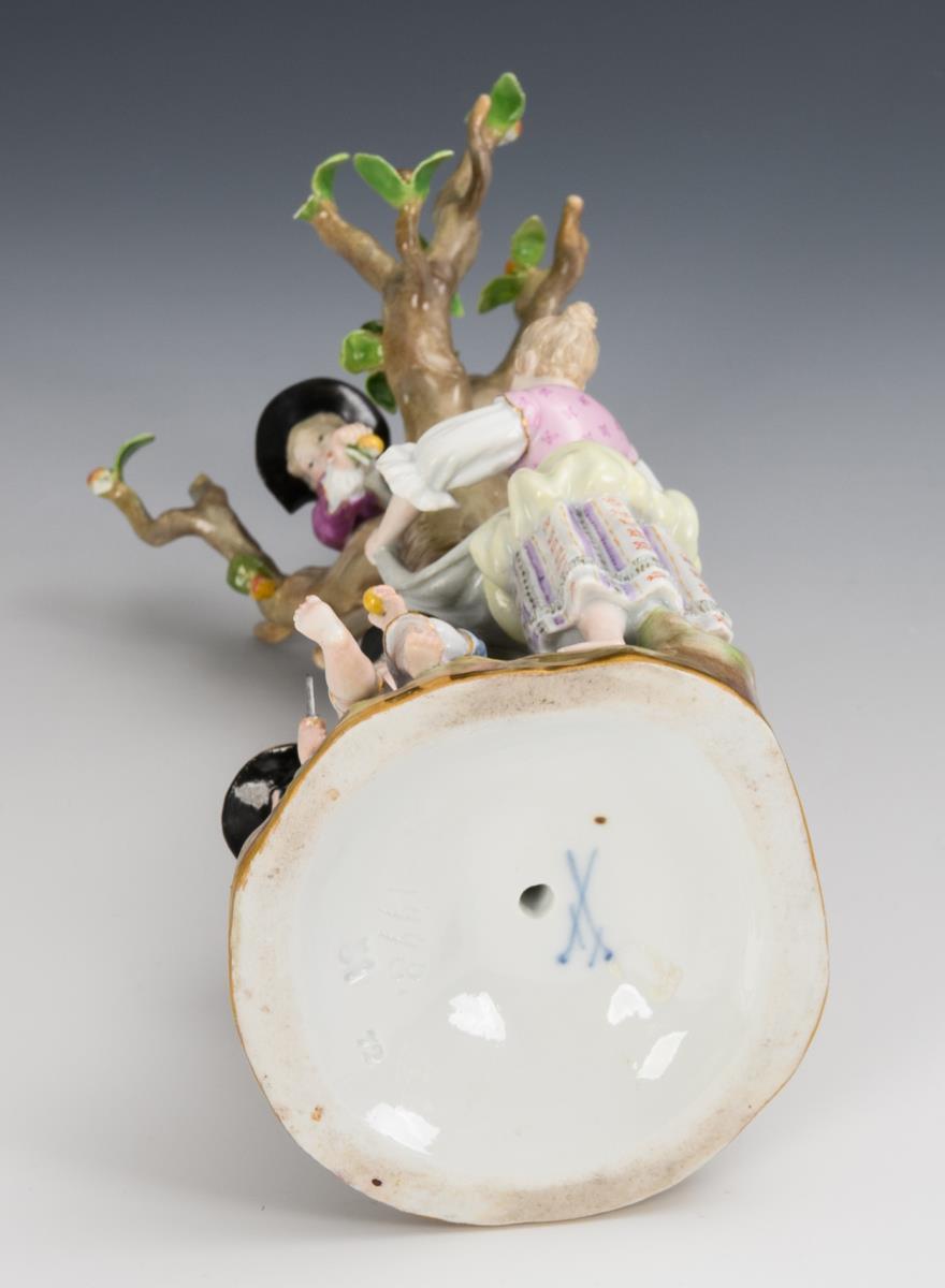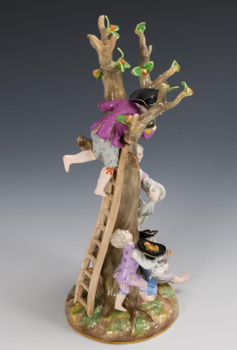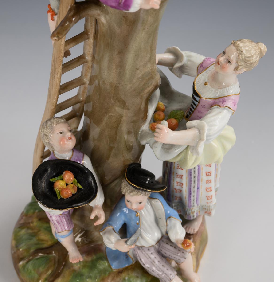 Boy standing on a ladder picking apples, under the tree a young woman and two children catching and slicing the apples. Knife, branches and left leg of the apple picker restored.