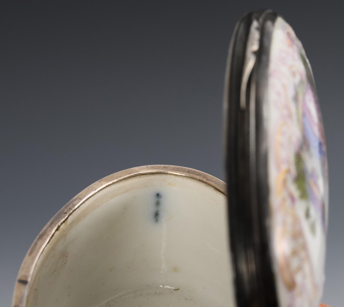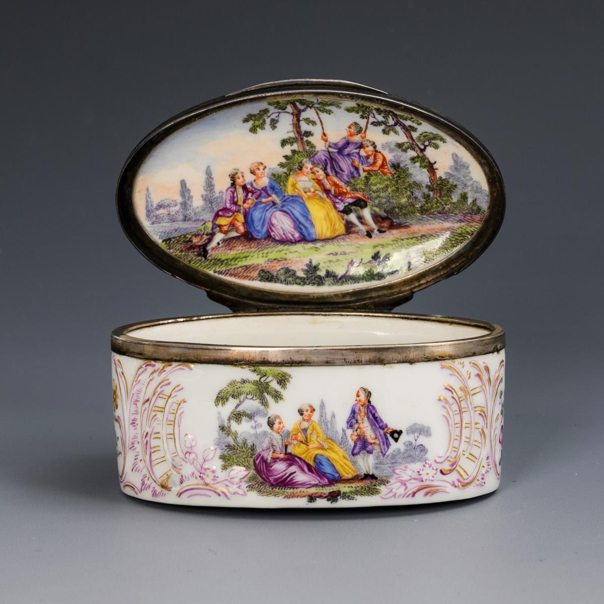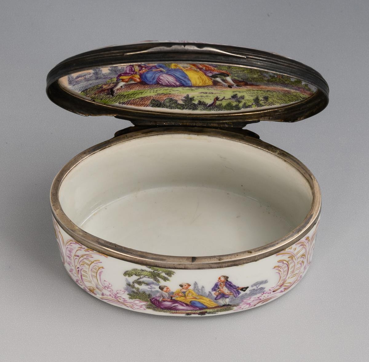Oval tabatiere with metal-mounted hinged lid, rocaille relief and depiction of gallant scenes. Partial gold decoration.