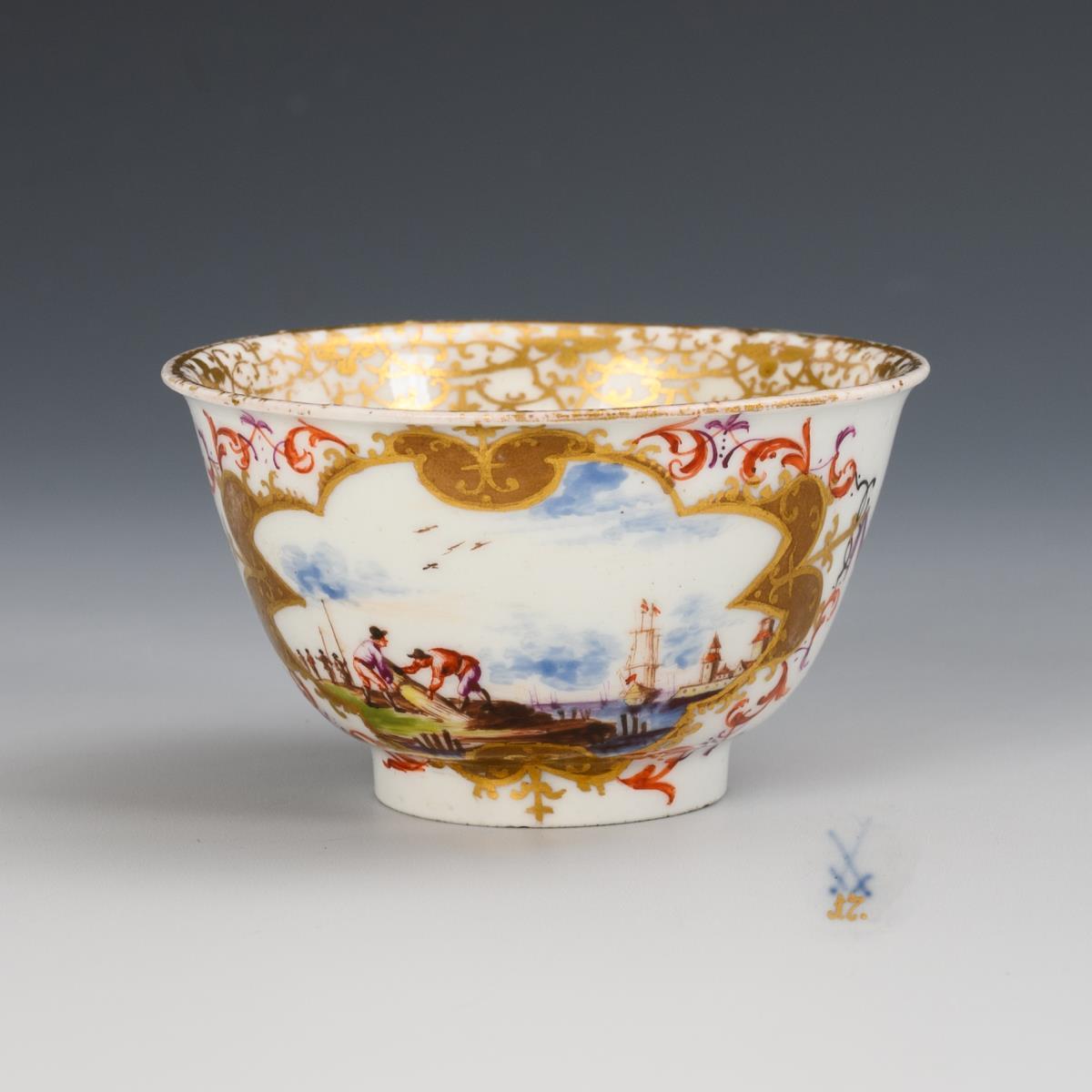On both sides a polychrome oval cartouche depicting coastal landscapes with merchants and goods. Gold somewhat rubbed.