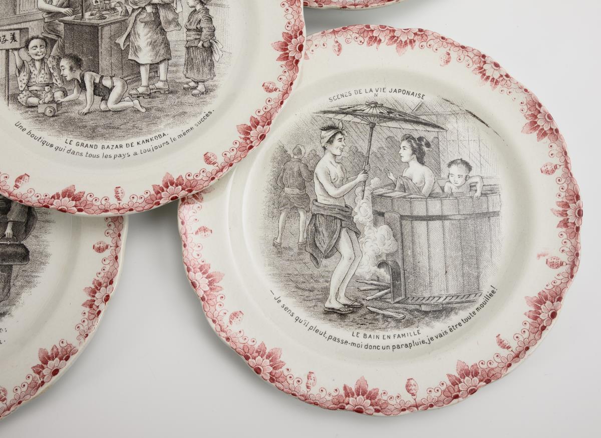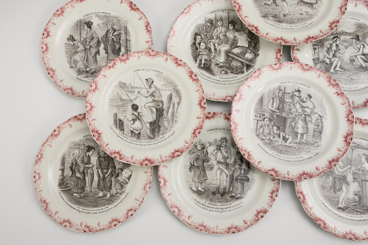 12 rare plates with scenes of everyday life and figures from the series "Scènes de la vie japonaise". HB & Cie, Choisy-le-Roi.