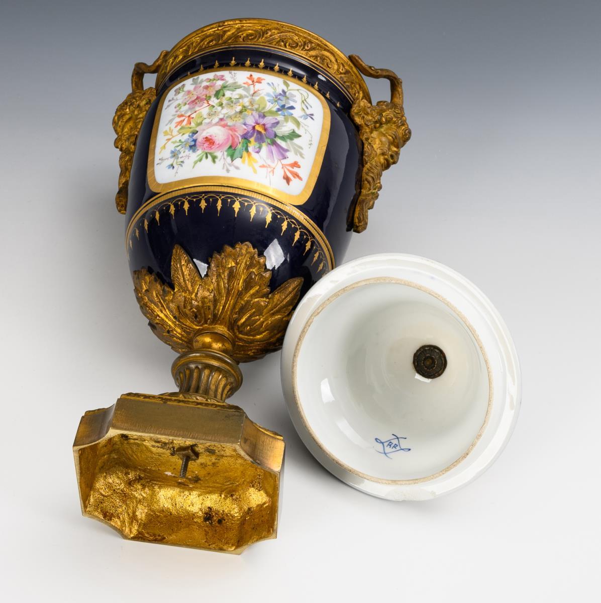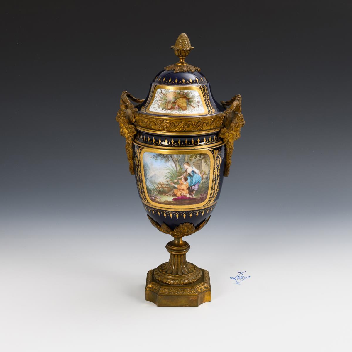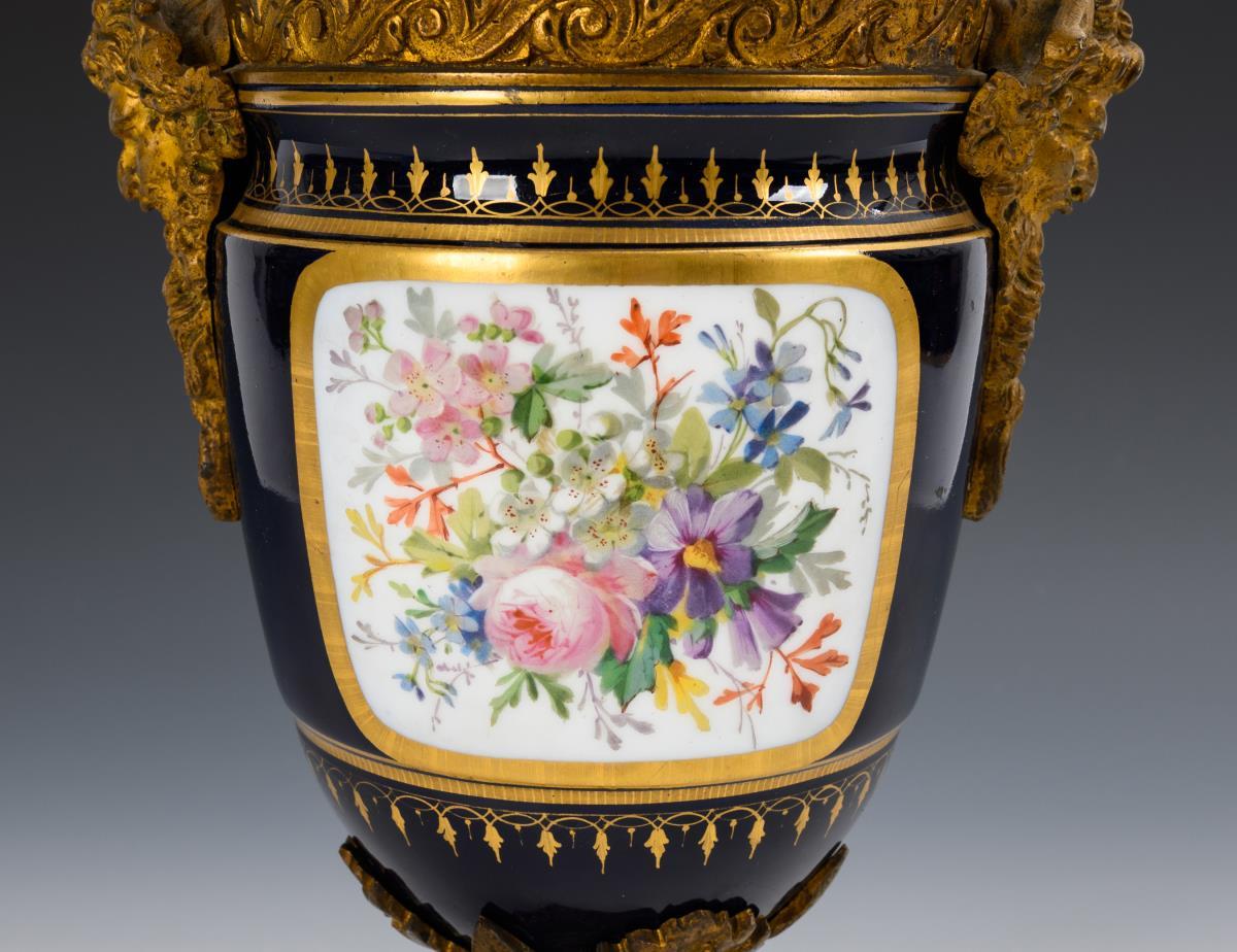 Ovoid body, bronze mount with two mascaron handles, lid with bronze knob and bronze foot. Cobalt background, on the front a rectangular cartouche depicting a pair of gardeners in a landscape, on the reverse and on the lid a bouquet of flowers. Bump on the edge of the lid.