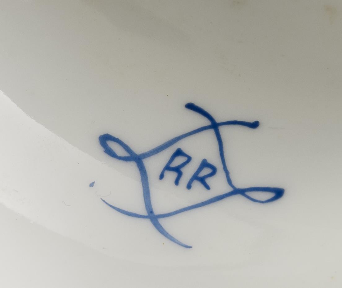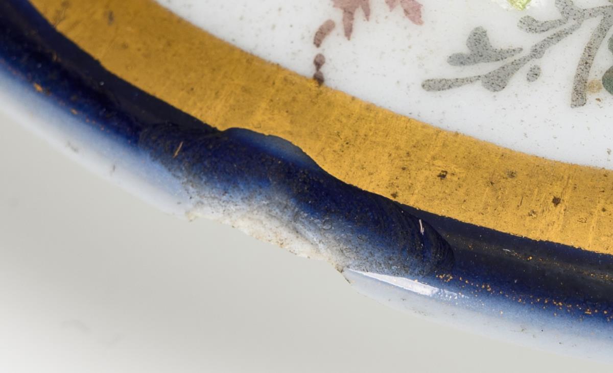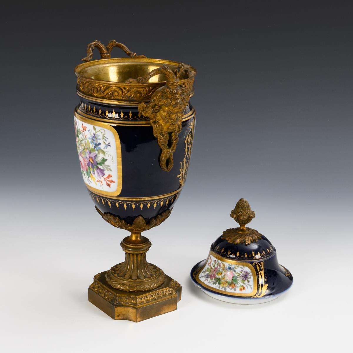 Ovoid body, bronze mount with two mascaron handles, lid with bronze knob and bronze foot. Cobalt background, on the front a rectangular cartouche depicting a pair of gardeners in a landscape, on the reverse and on the lid a bouquet of flowers. Bump on the edge of the lid.