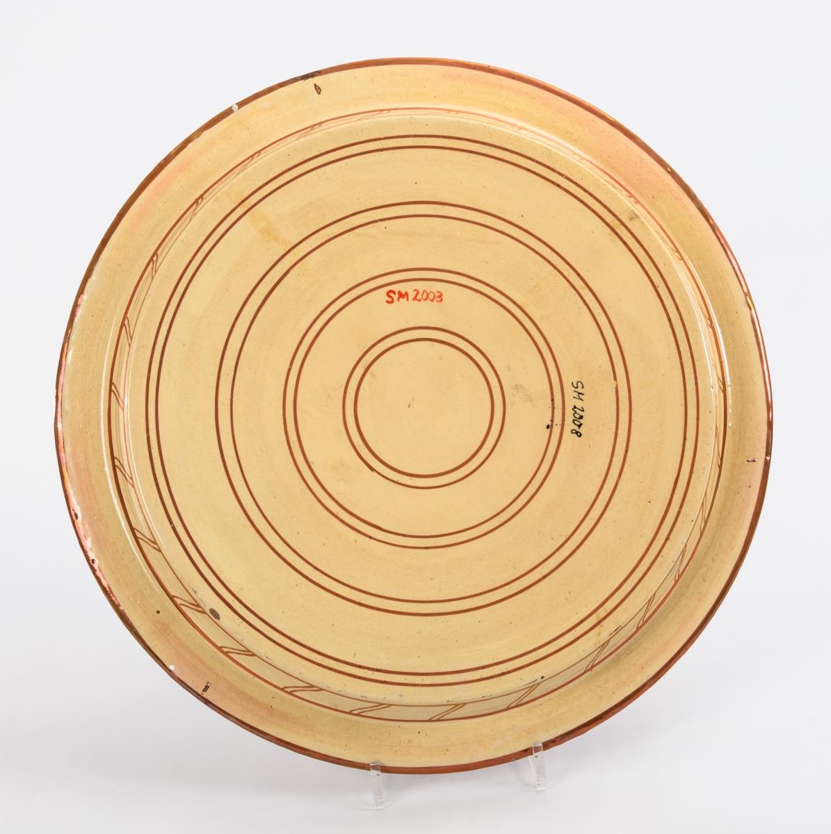 Ivory-colored ground, painted in cobalt blue and copper-colored luster (metal lustrum). Ø 46.5 cm.