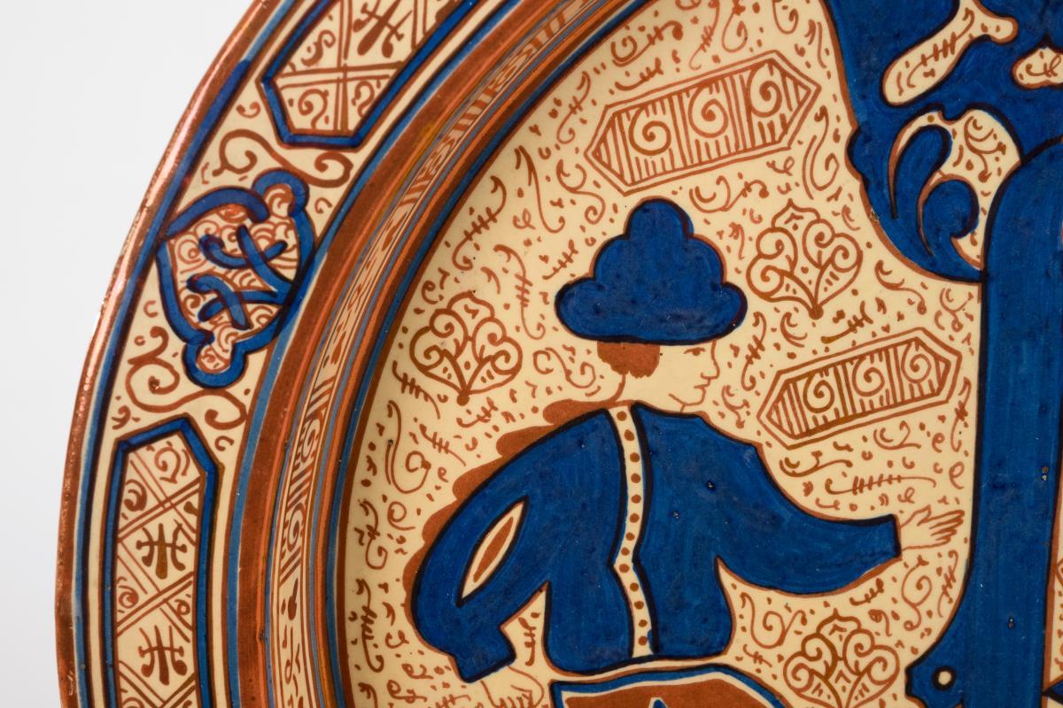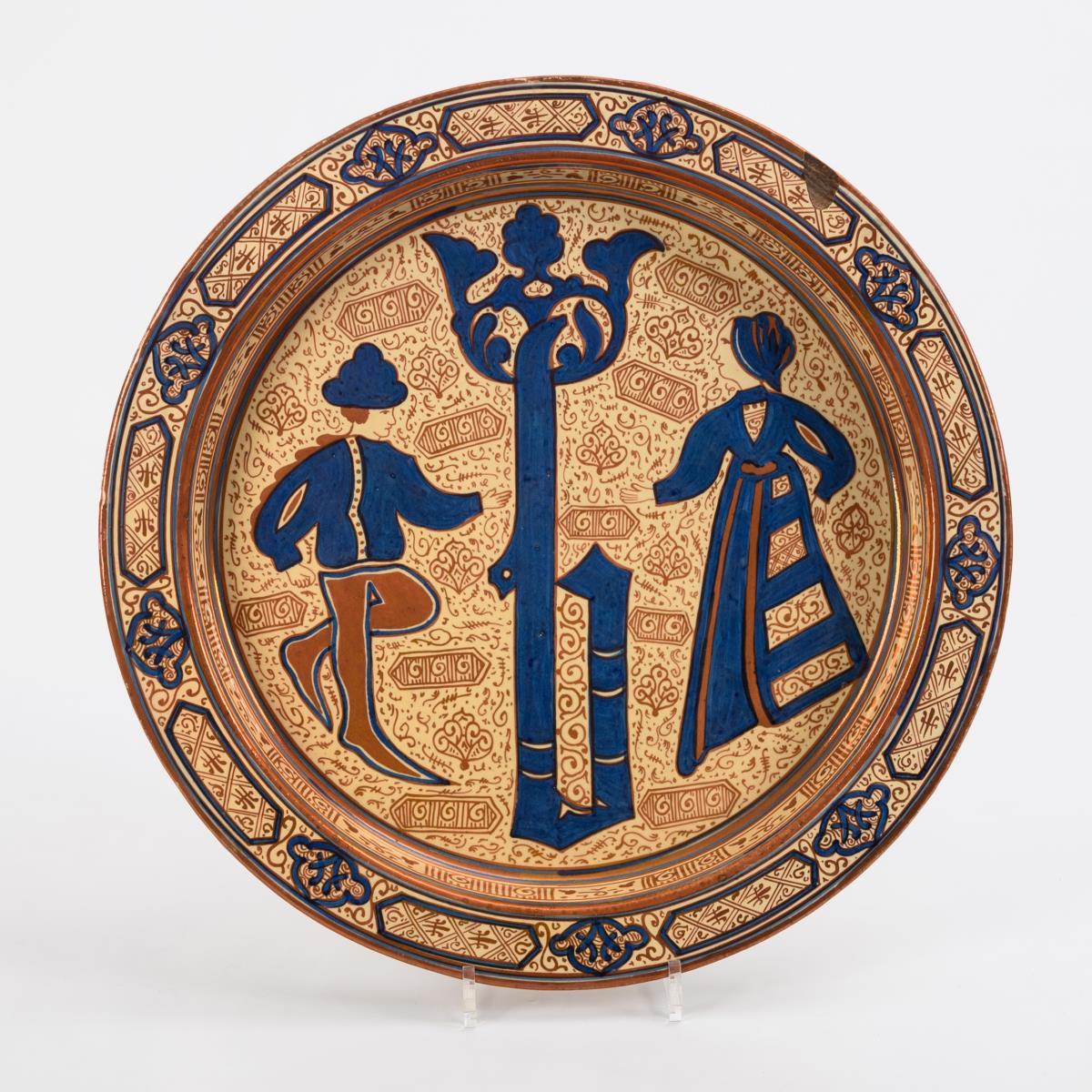 Plate decorated in the style of Valencian Gothic/Renaissance majolica with a high rim and wide rim. Central, embossed minuscule "b" in blue, Gothic script, flanked by a man and a woman, surrounded by cartouches and stylized floral decoration. Concentric circles on the underside. Bumped on the edge and underside.