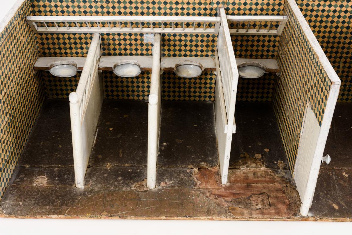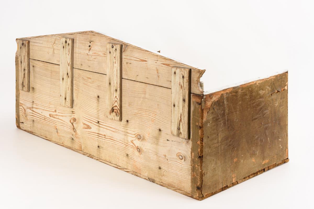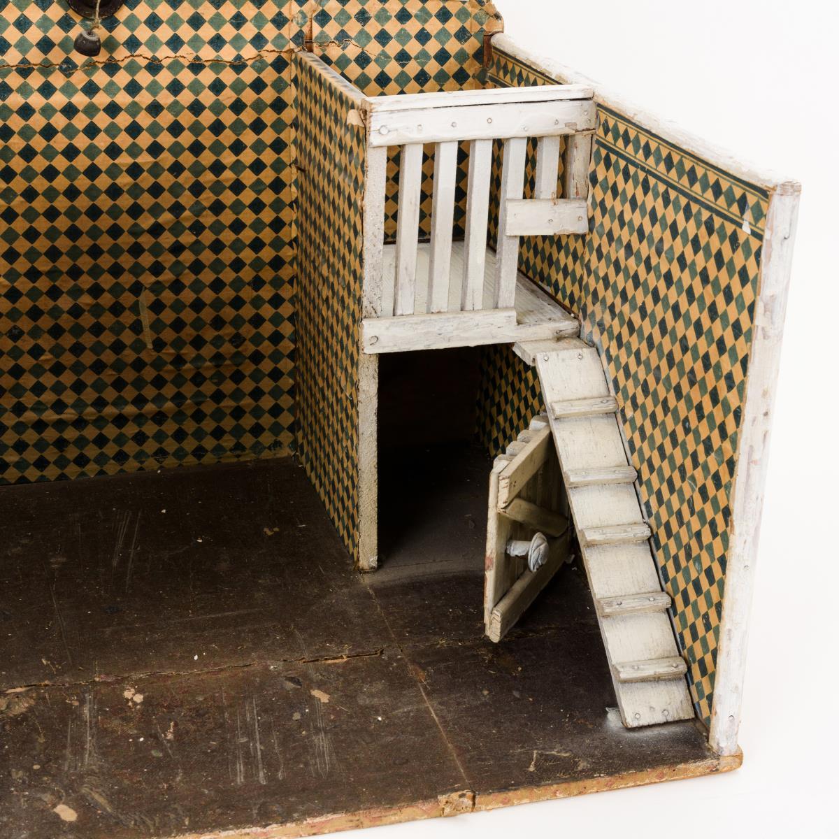 Bespielt, Farbe teils nachgebessert, Altersschäden, Fehlstellen im Wachstuch des Bodens.