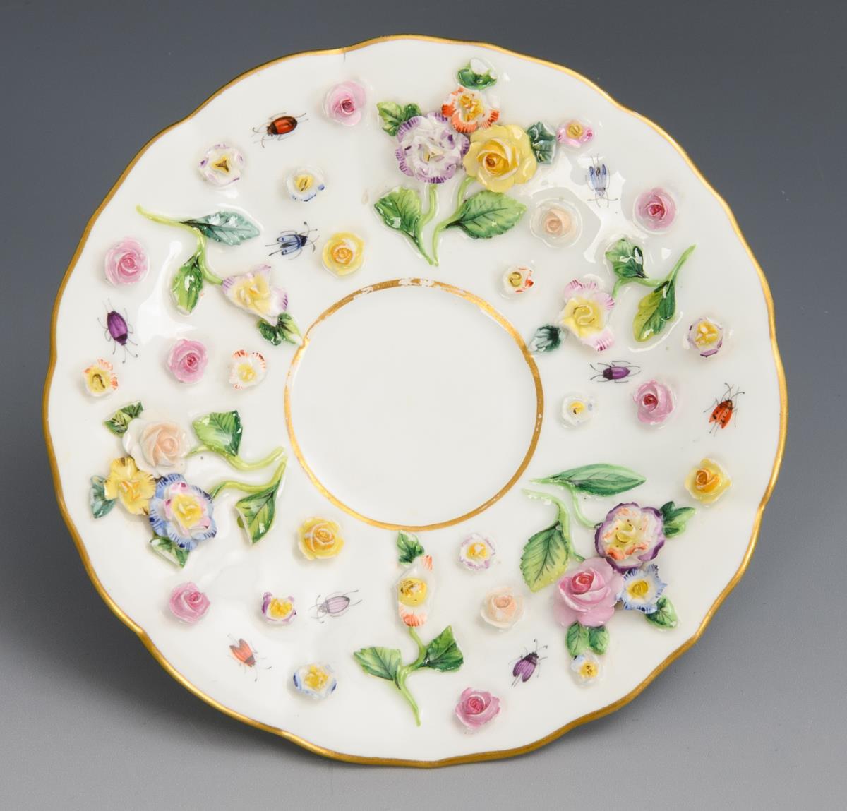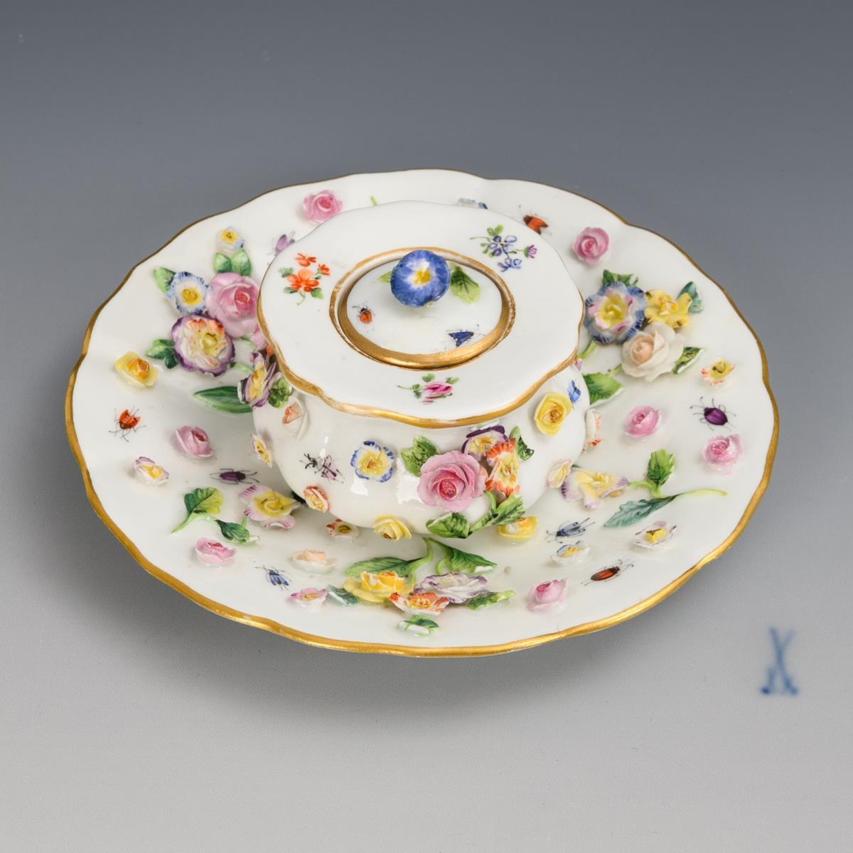 Polychrome painted, gilt. Inkwell (h 5 cm), original saucer (Ø 14.5 cm).