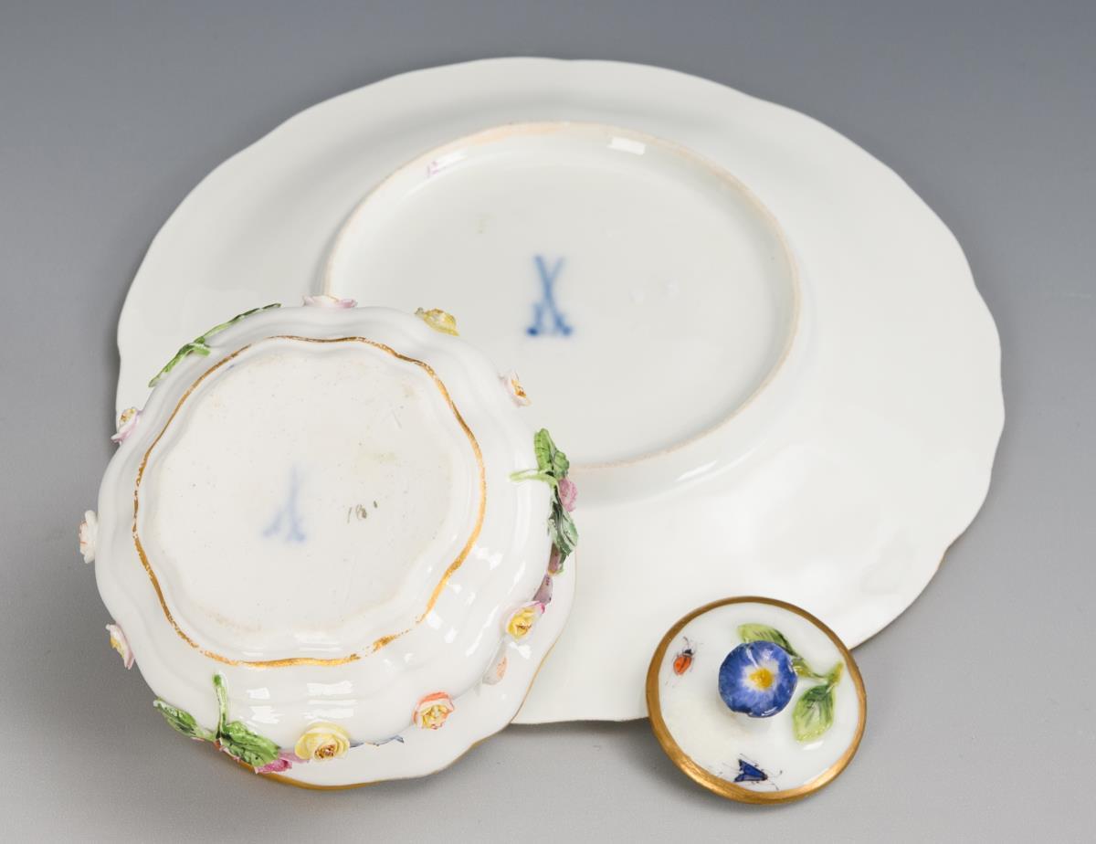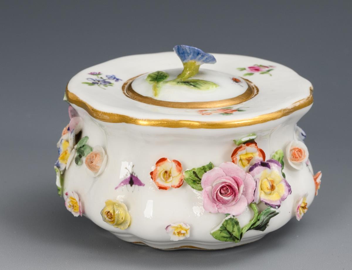 "New cut-out". Lid restored, chips to the lining, minimal burn mark to the rim of the plate, partial gold abrasion.