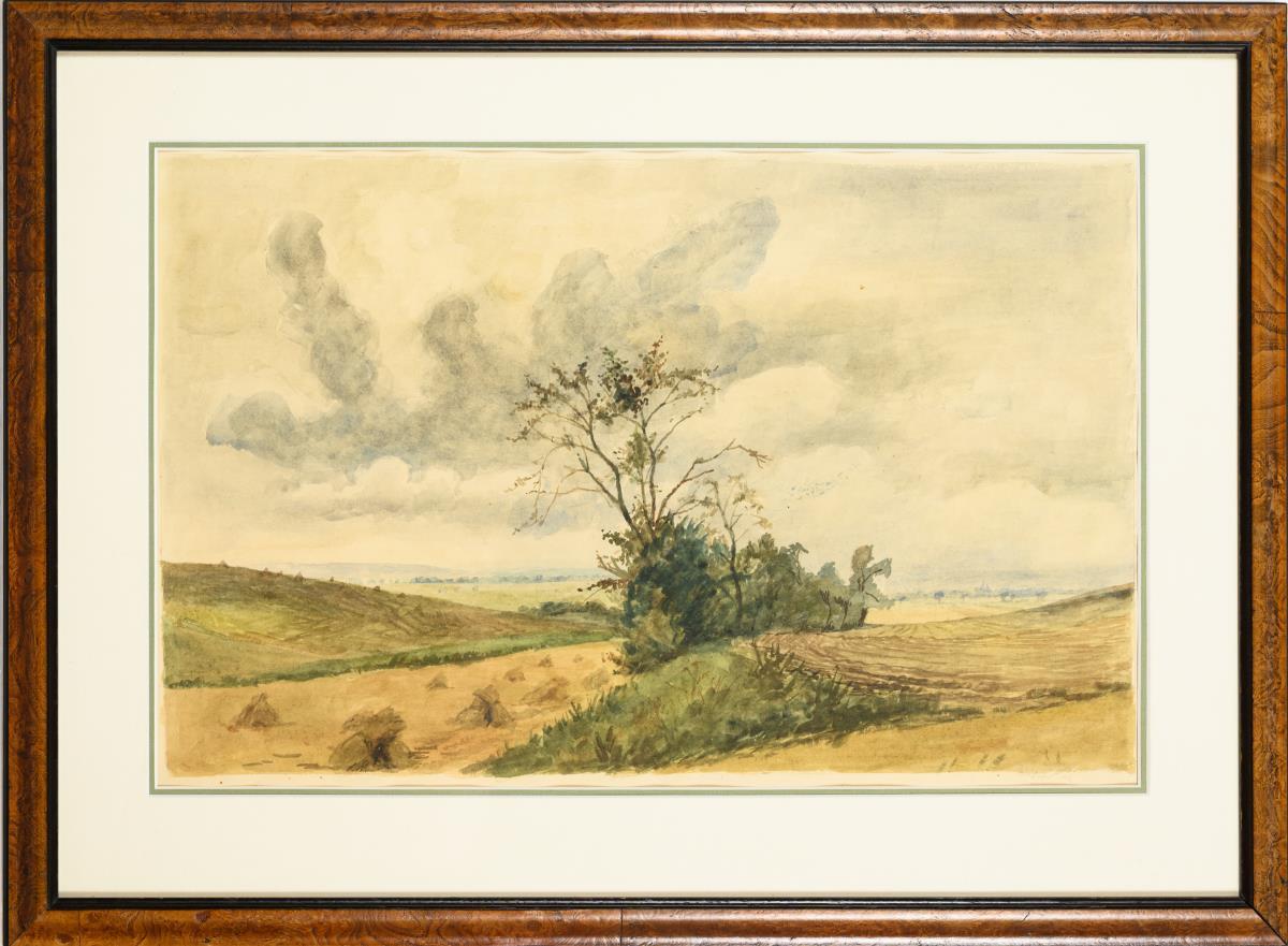 Hilly Thuringian landscape with hay sheaves in the fields under a cloudy sky.