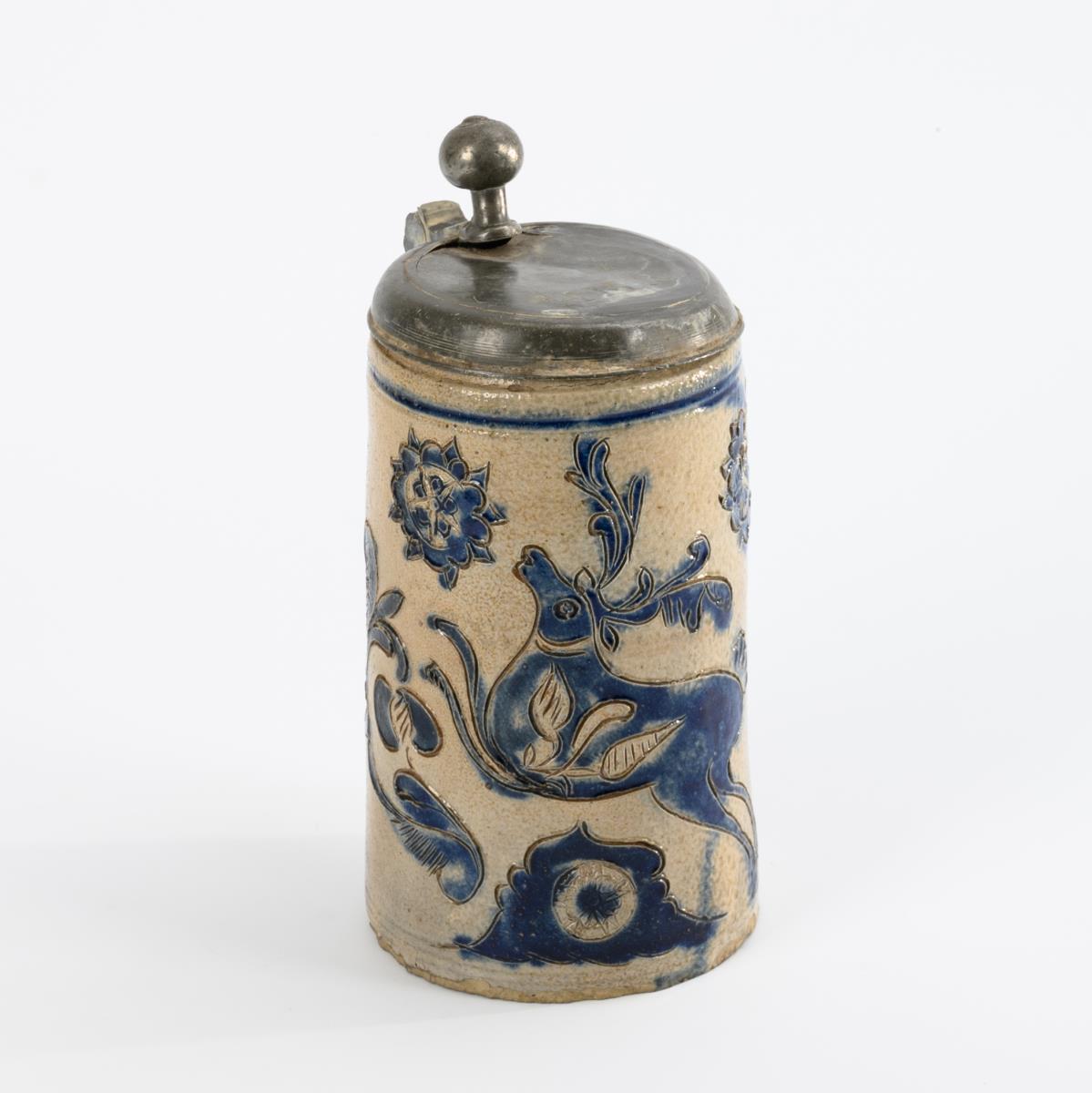 Grey, salt-glazed stoneware with incised and stamped decoration, painted in cobalt blue. H 23.5 cm.