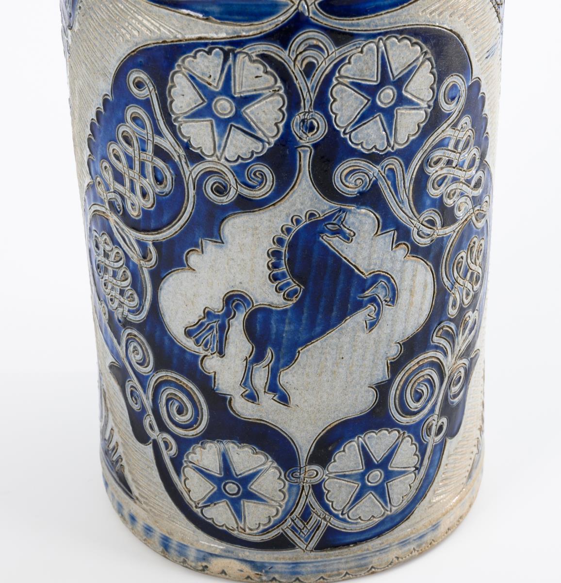 Westerwald roller jug with a leaping horse and ornate scroll and leaf tendril work.