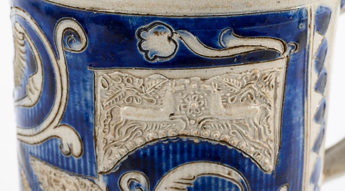 Westerwald roller jug with elaborate matrix decoration.