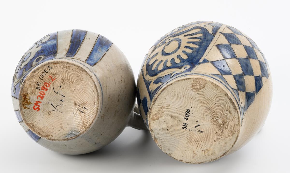 Grey, salt-glazed stoneware with incised decoration, painted in cobalt blue. H 37.5 and 39 cm.