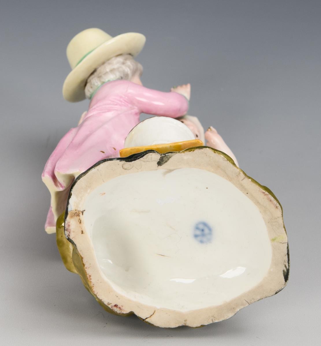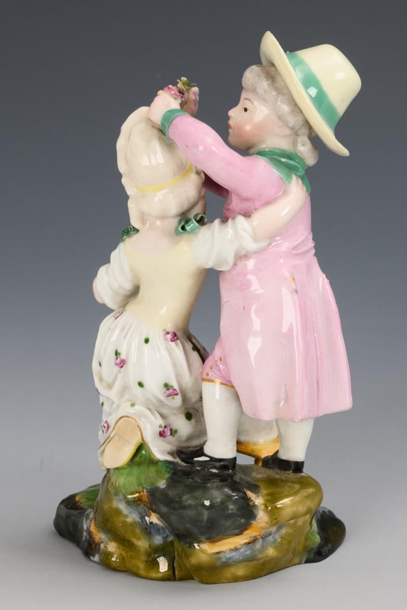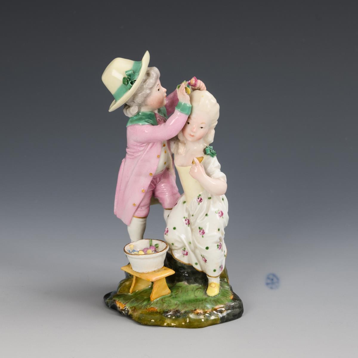 Couple of children on a natural plinth, the boy putting flowers in the girl's hair. Small fire crack to the edge of the plinth, footrest and hat of the boy restored, mirror in the girl's hand missing, flowers partially chipped.