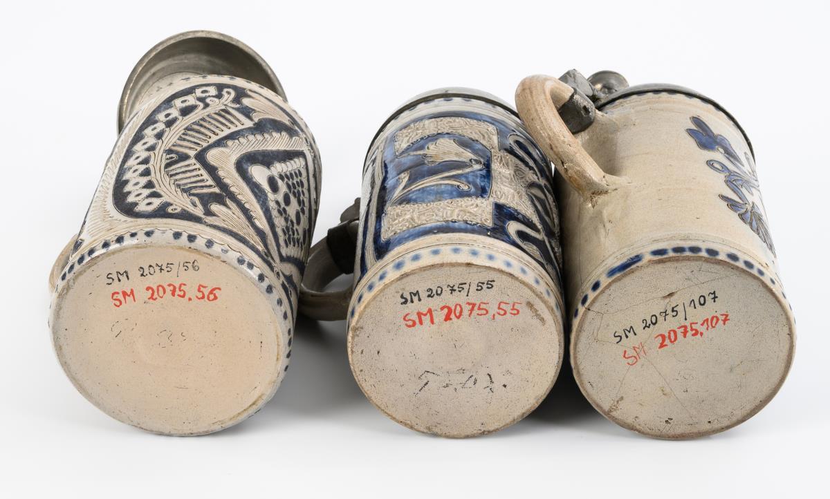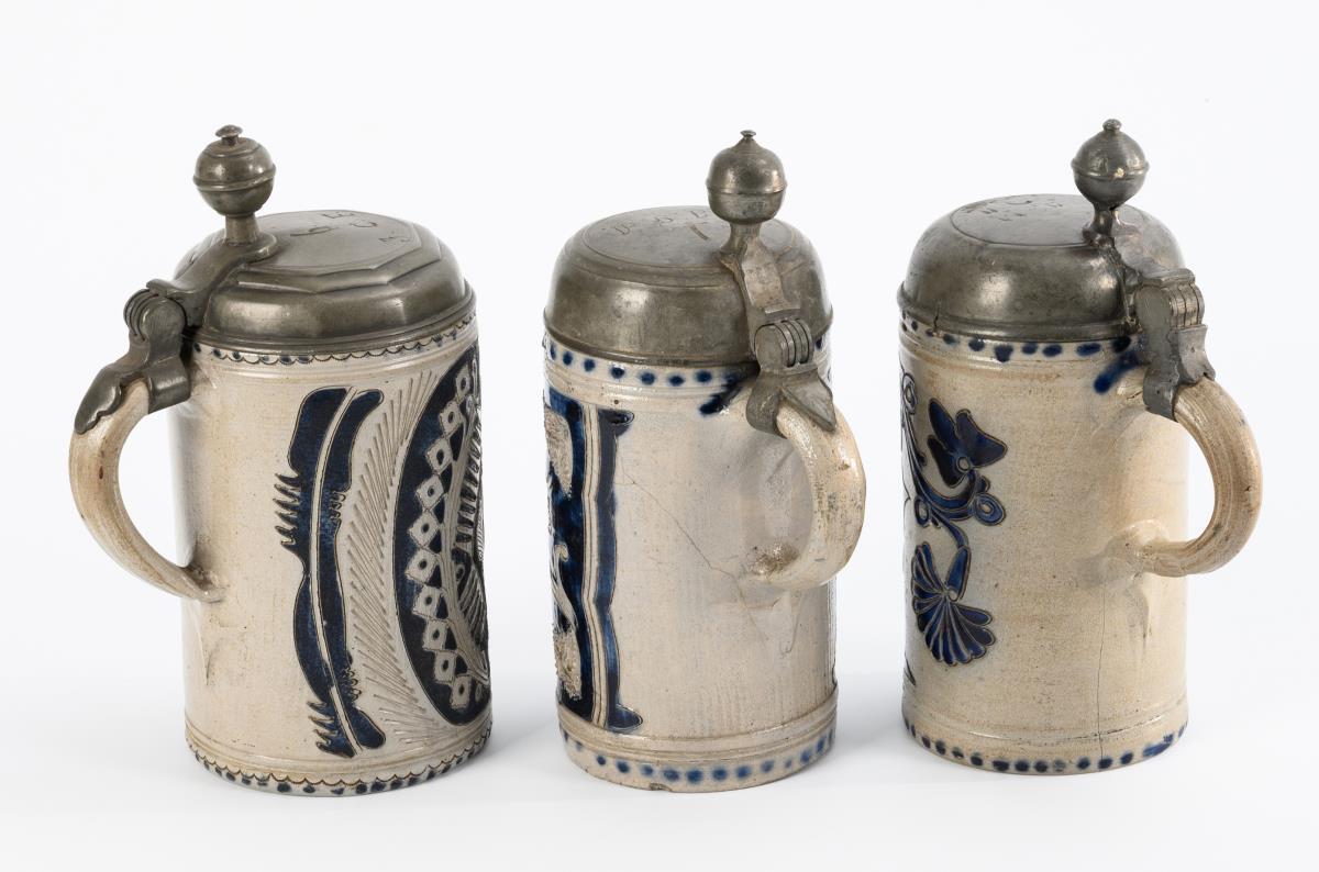 3 Westerwald roller jugs with fine matrix and incised decoration.