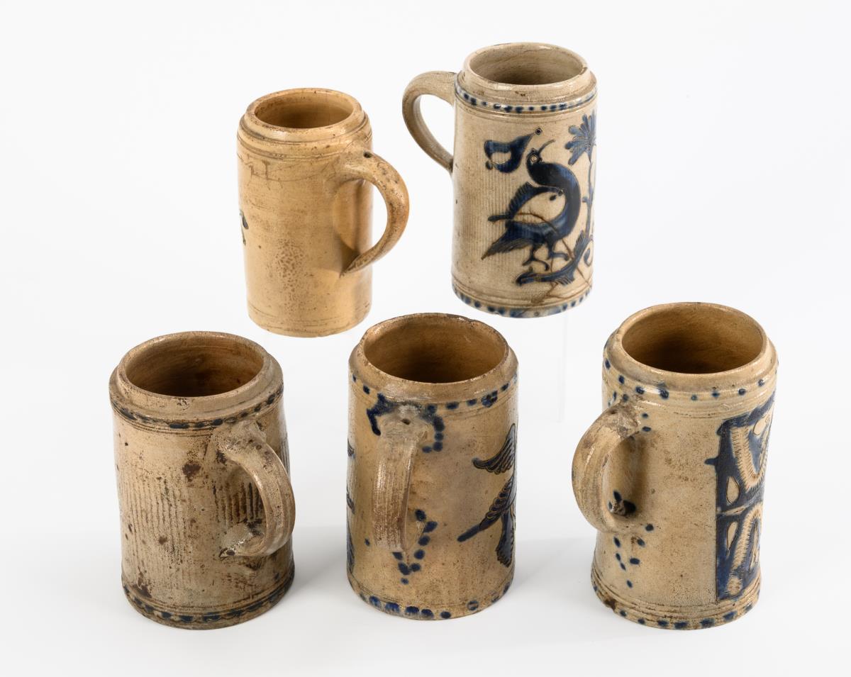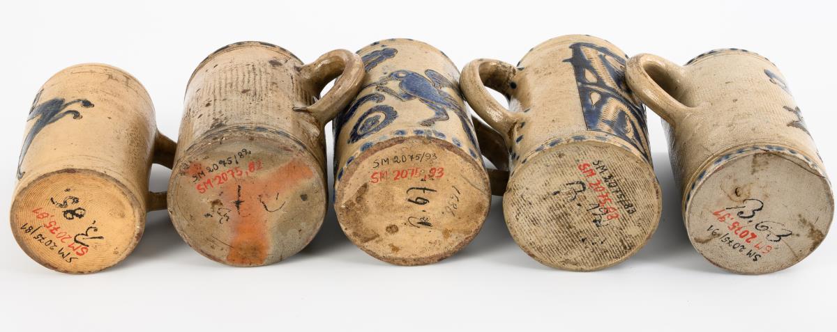 Grey, salt-glazed stoneware with incised and stamped decoration, cobalt blue painting and dotted decoration. H 14.5 to 16.5 cm.