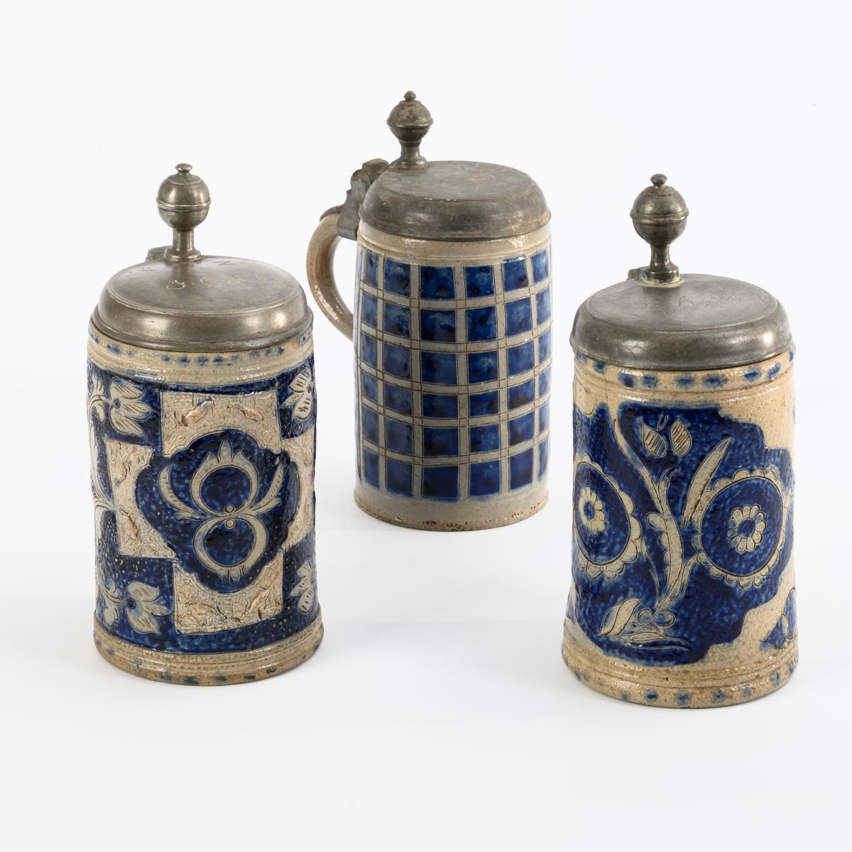 Grey, salt-glazed stoneware with incised, model and stamped decoration, cobalt blue painting, partly dotted decoration. H 19.5 to 21 cm.