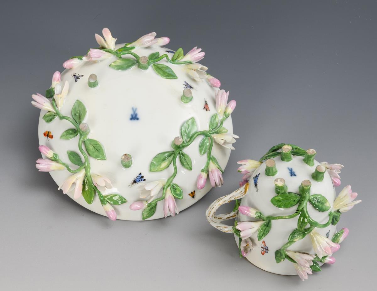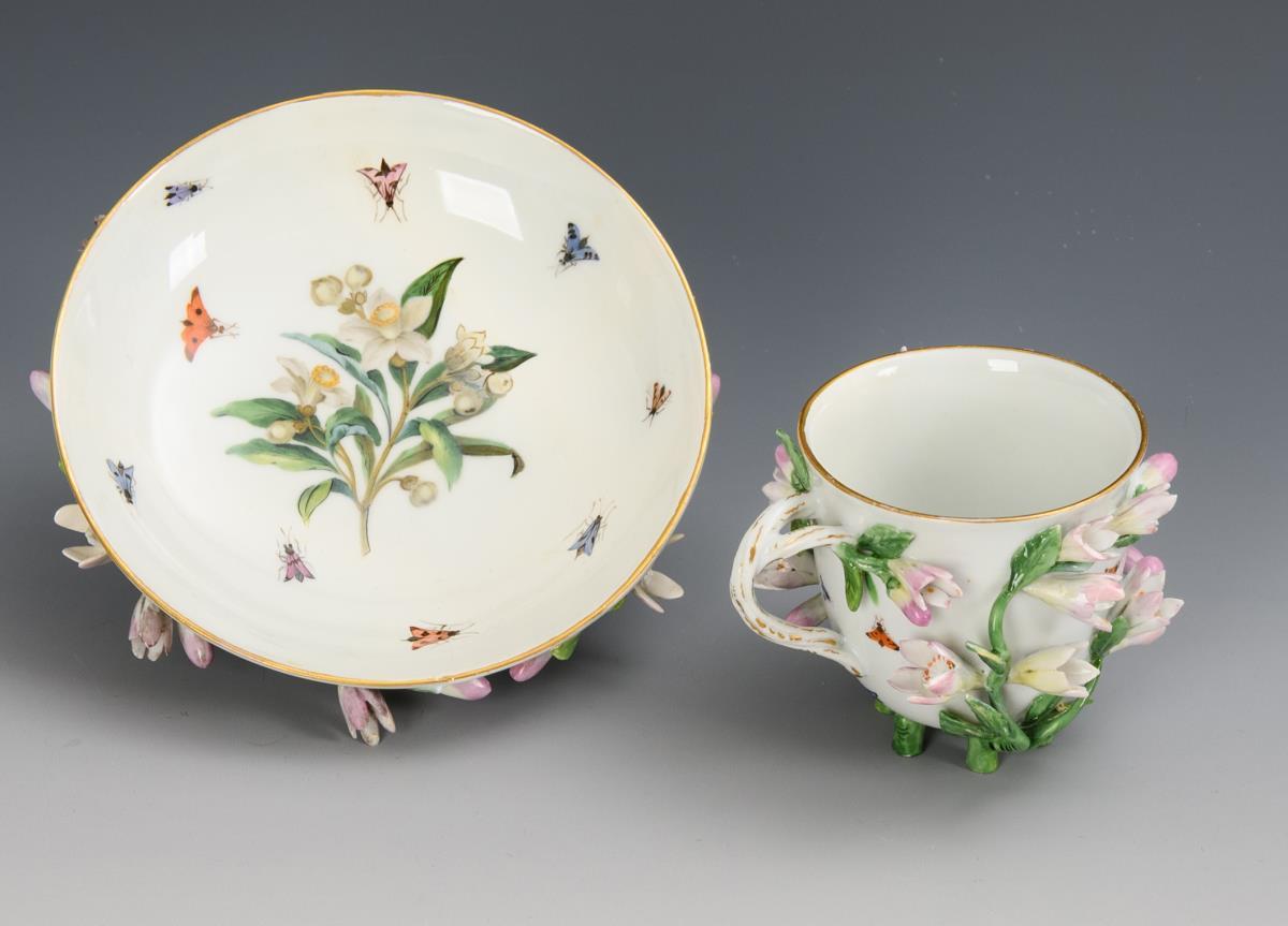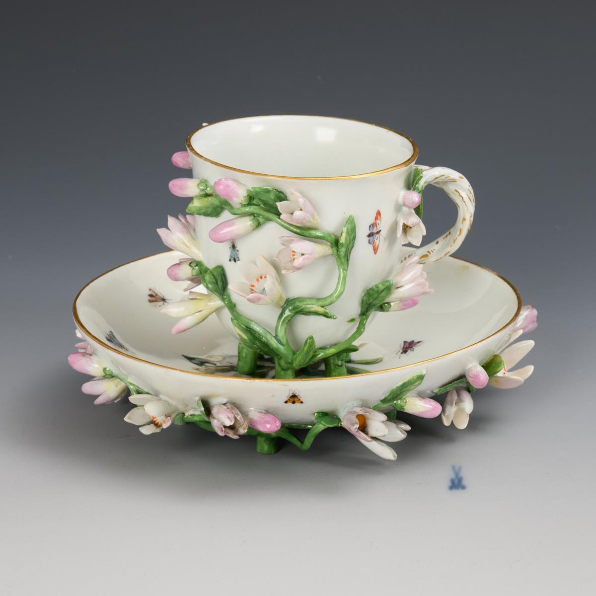 Bell-shaped cup with a twisted branch handle and six feet, richly decorated with lemon blossom branches. The mirror of the saucer depicts a lemon blossom branch surrounded by insects. Cup and saucer restored.