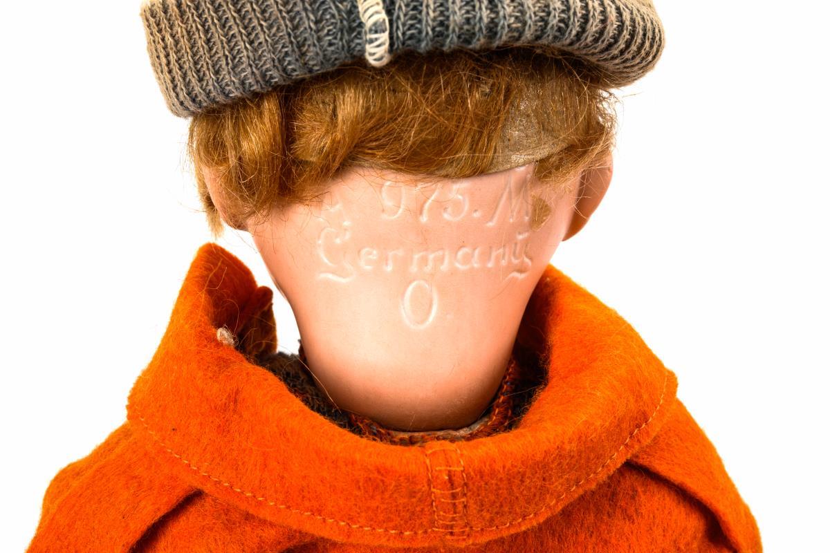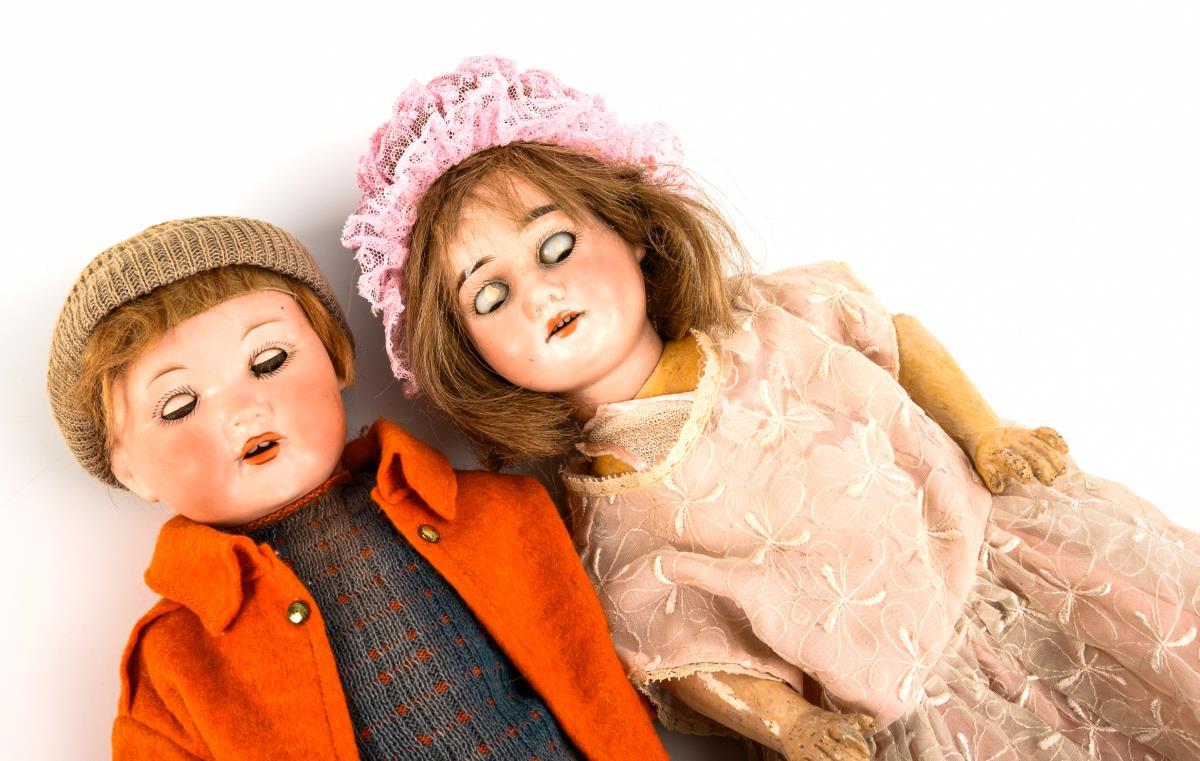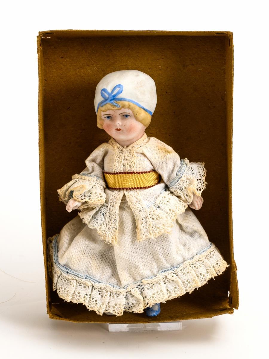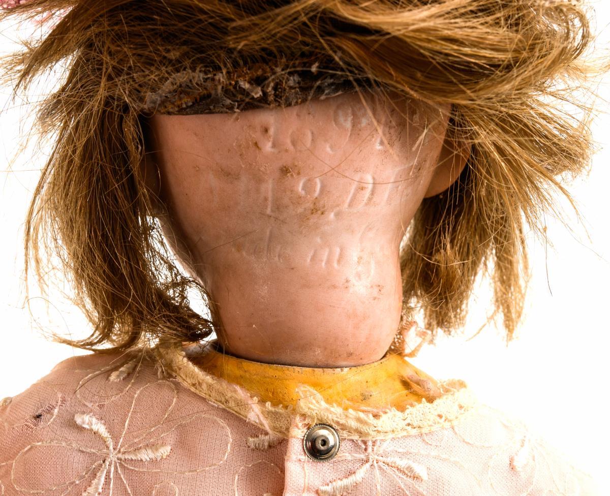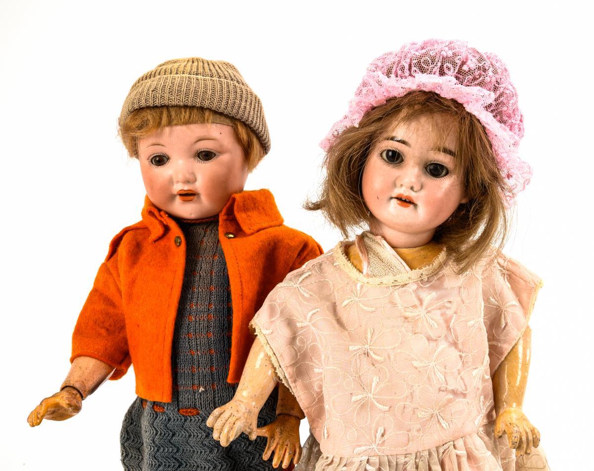 2 dolls with crank head, brown sleeping eyes, blond wig and jointed body: 1x AM 975 in knitted dress and felt jacket (L 40 cm) and 1x AM 1894 in pink tulle dress and hood (L 40 cm). Also a small all-bisque doll with modeled hood (probably replica), stapled in cardboard (L 13 cm). Signs of age, wigs fixed: heads not x-rayed, bodies partly painted over.