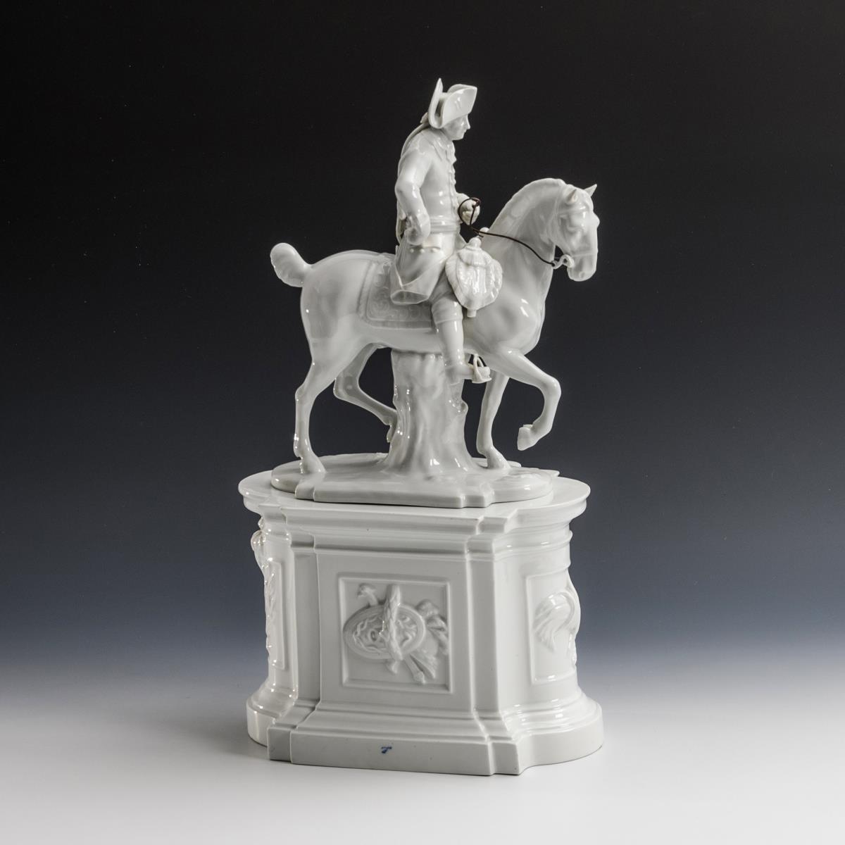 Sculpture of the Prussian King Frederick II on horseback (H 29.5 cm). / Architectural plinth with trophy reliefs and the monogram "FR" (= Fridericus Rex) (H 19 cm). Restored sword and curb bit.