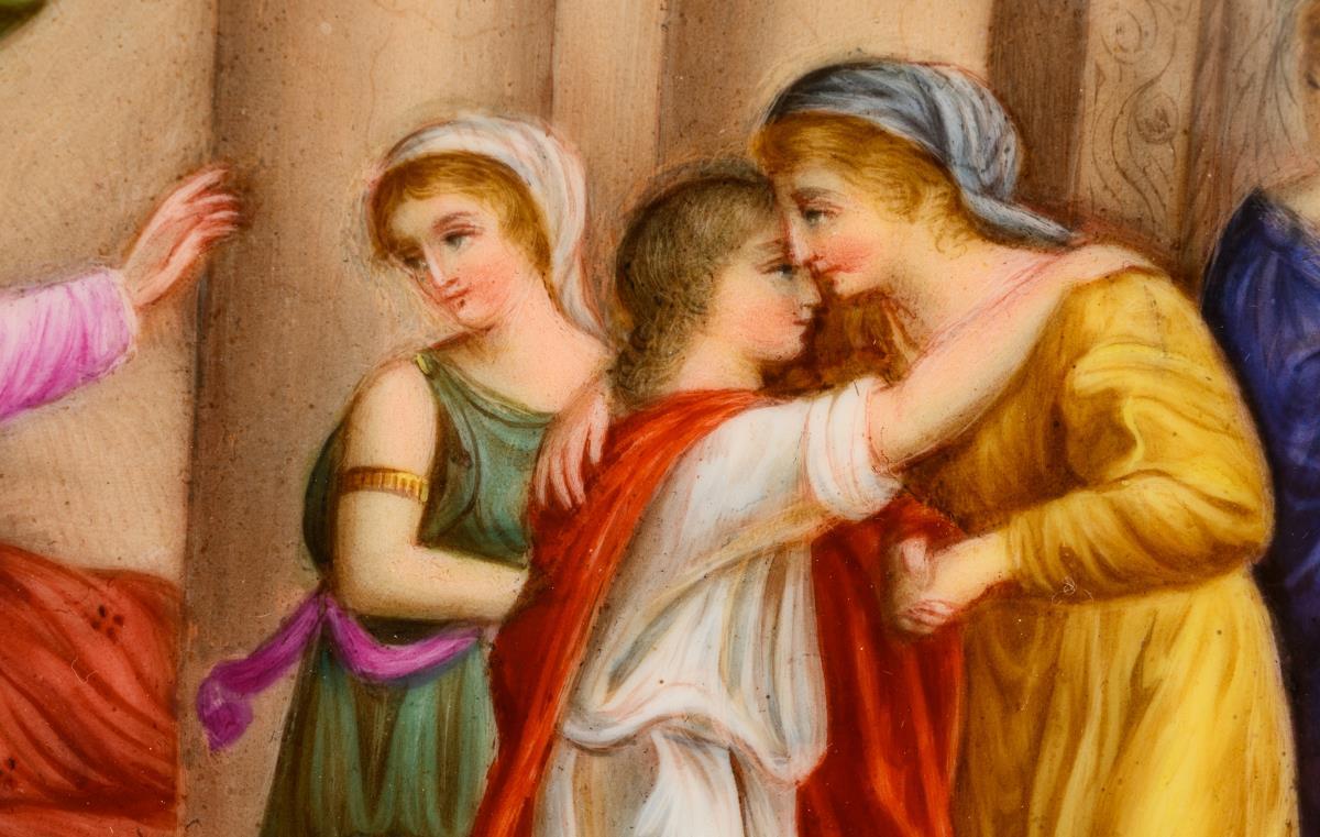 In the mirror an allegorical depiction after Angelika Kauffmann, on the rim variously colored partial funds with rich ornamental gold relief painting and jewel painting, inscribed "Penelope" on the underside. 2 minimal paint chips to the rim and 1 minimal paint retouch to the rim of the plate.