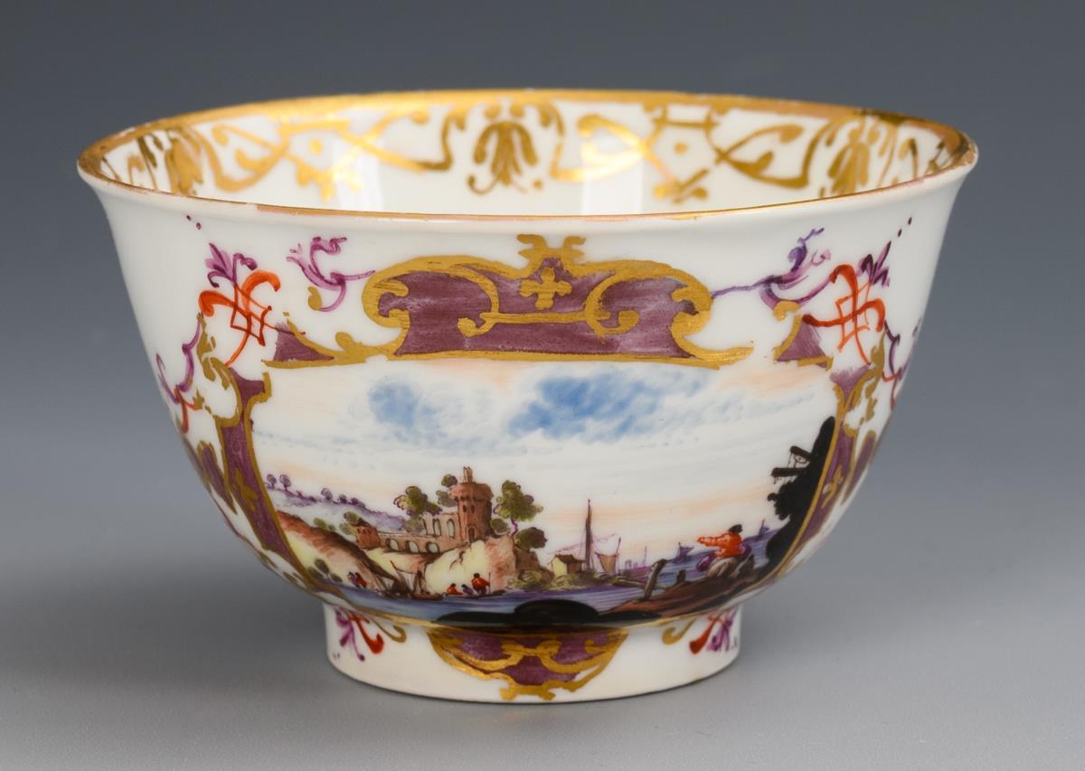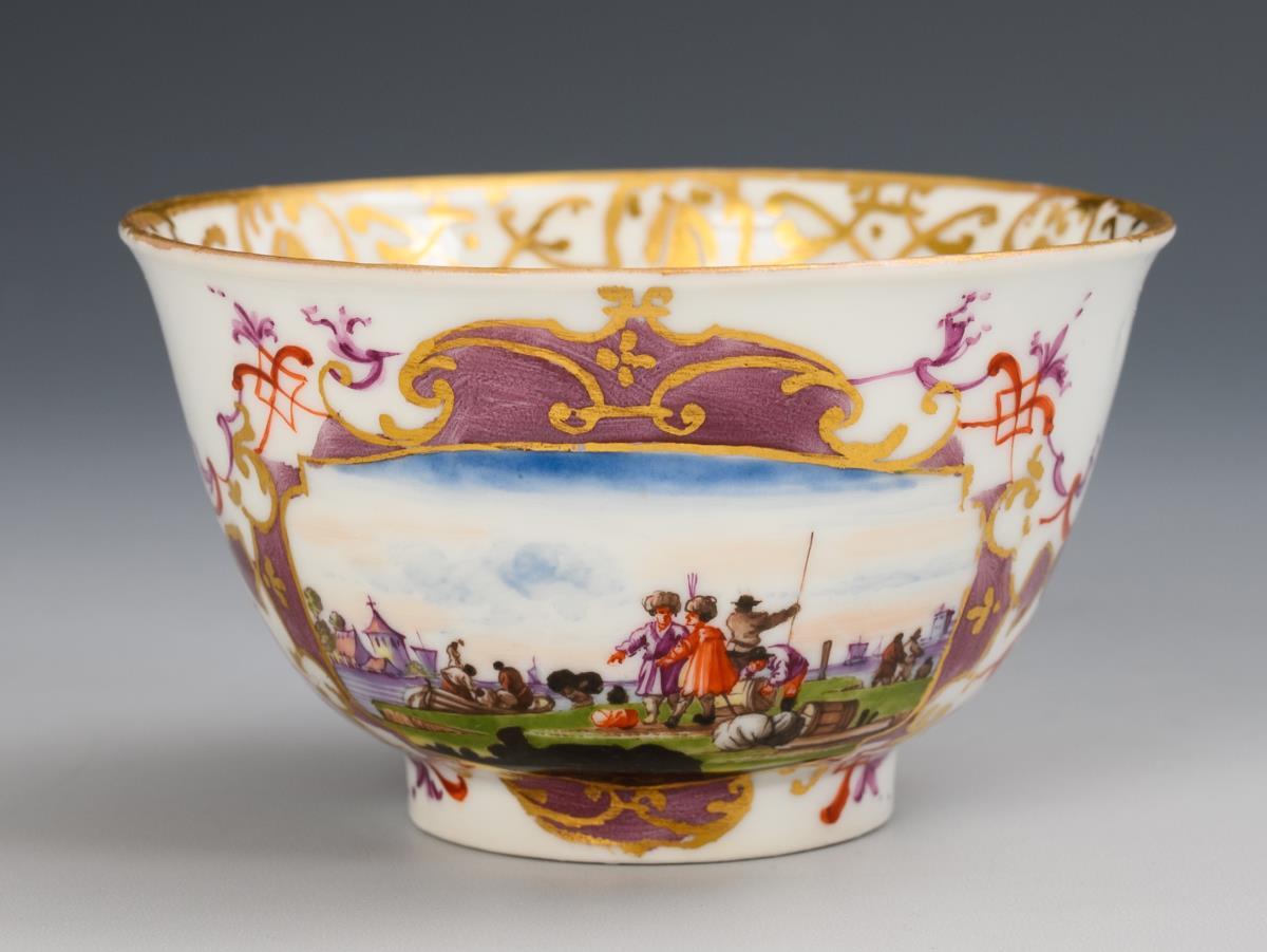 Sword mark, circa 1730/40 and gilder's mark "86" on small bowl and saucer with white turner's mark oo (= Johann Gottlieb Kühnel, 1702-1774).