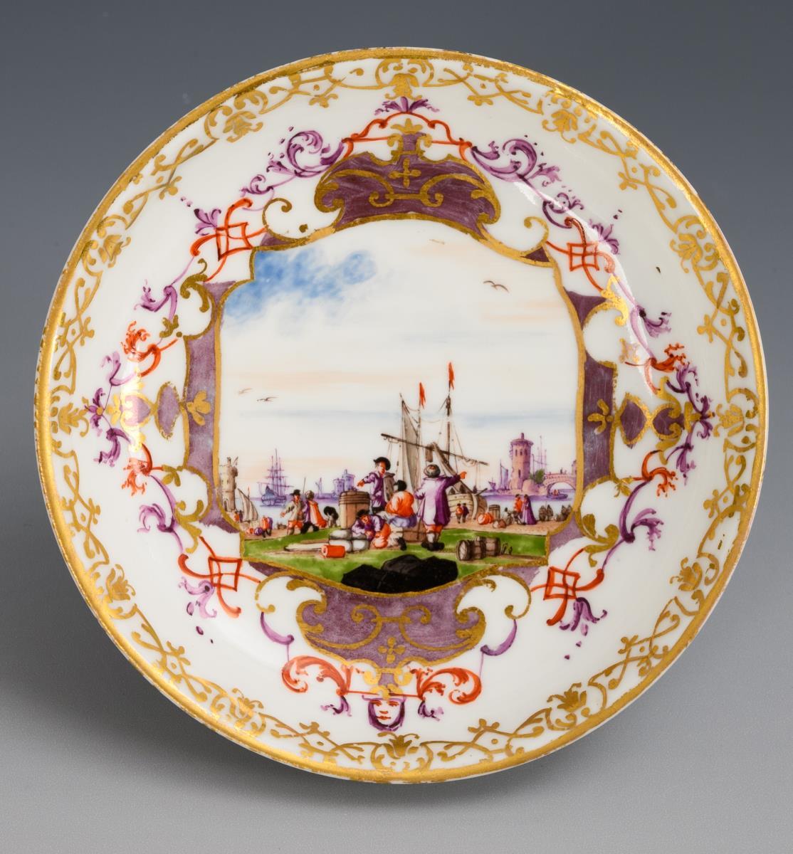 Baroque small bowl with saucer and Kauffahrteimalerei. Meissen.