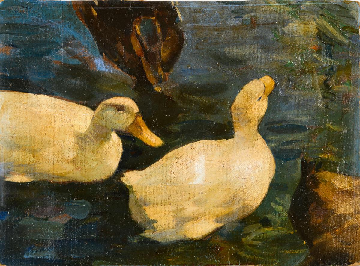 Oil/painting card. Unsigned, duck head studies on verso. Late 19th century