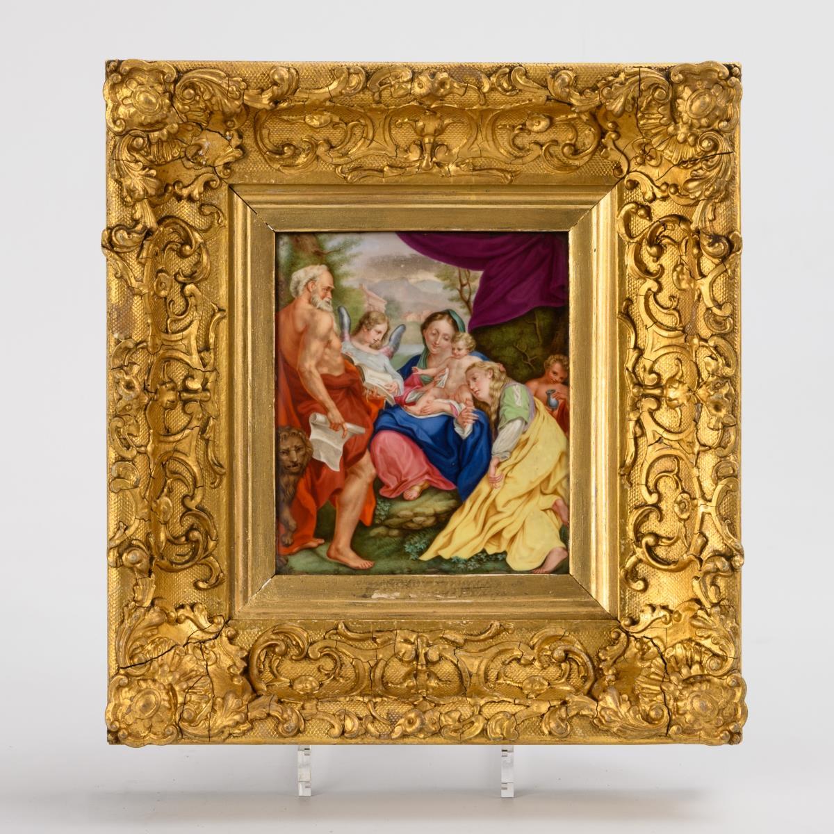 Rectangular panel depicting the Madonna and Child surrounded by St. Jerome, St. Mary Magdalene, St. John the Baptist and an angel, after a painting by the Italian painter Antonio Allegri, gen. Coreggio (1489-1534).