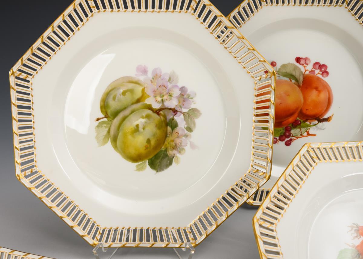 "Conical" model. Octagonal plates with openwork flag, each with a fruit bouquet in the mirror.