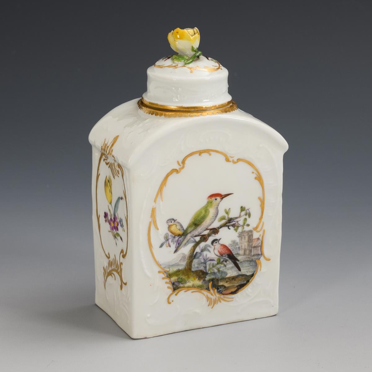 Rectangular box with rocaille relief and flower pommel lid. Relief cartouches depicting a hen with chicks and a tree with a green woodpecker and titmouse. Flower knob chipped.