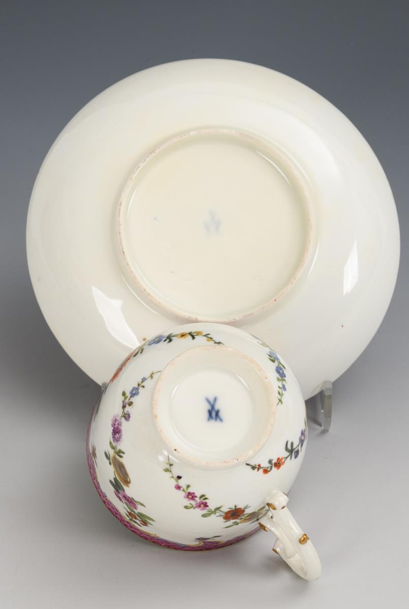 Polychrome painted, gilt. Cup (h 7 cm), original saucer (Ø 13.5 cm).