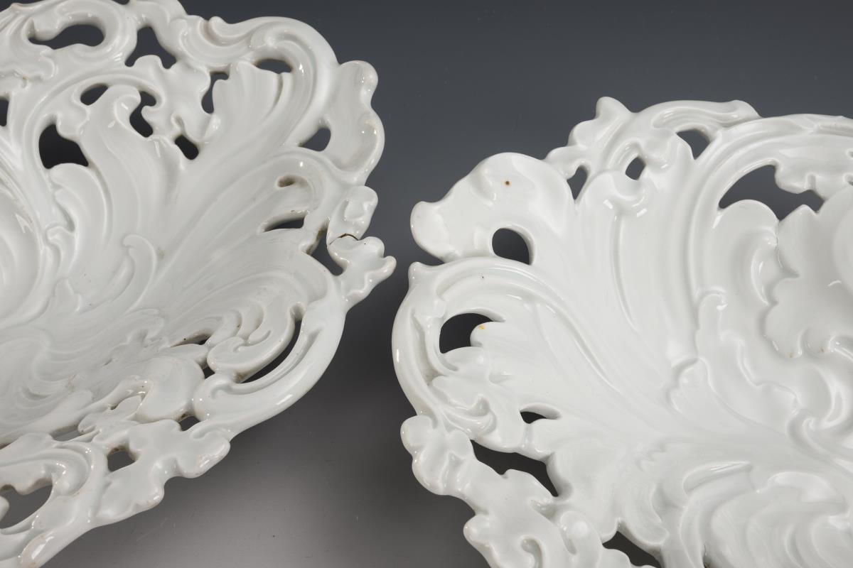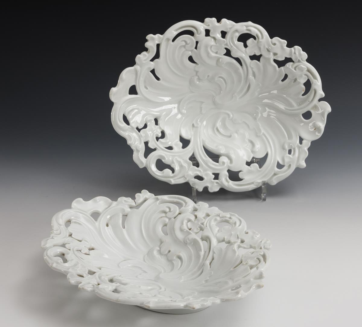 Acanthus leaf-relief bowls with openings. 1x rim abrasions to the underside, 1x firing crack to the rim.