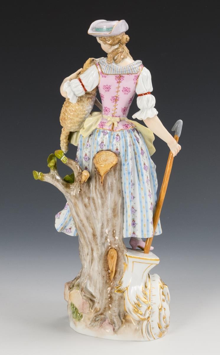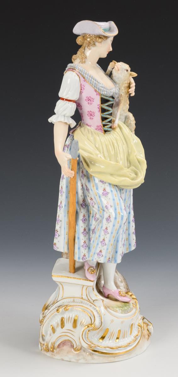 Shepherdess with lamb standing on a rocaille base on a tree trunk. Leaves, staff, left hand and fingers of the right hand restored, 2 leaves chipped.