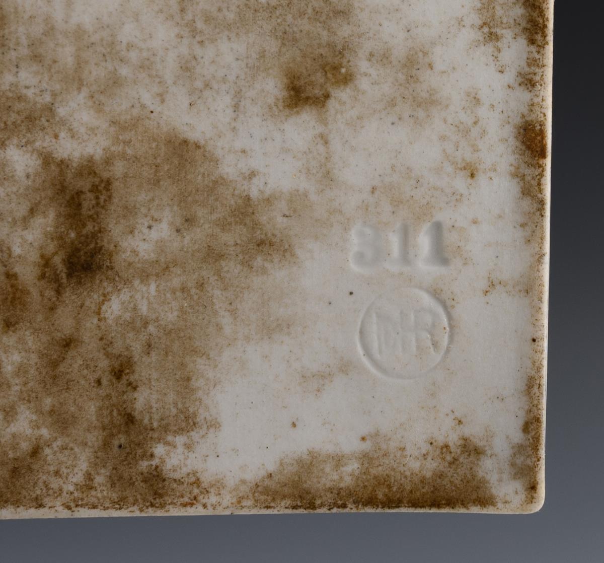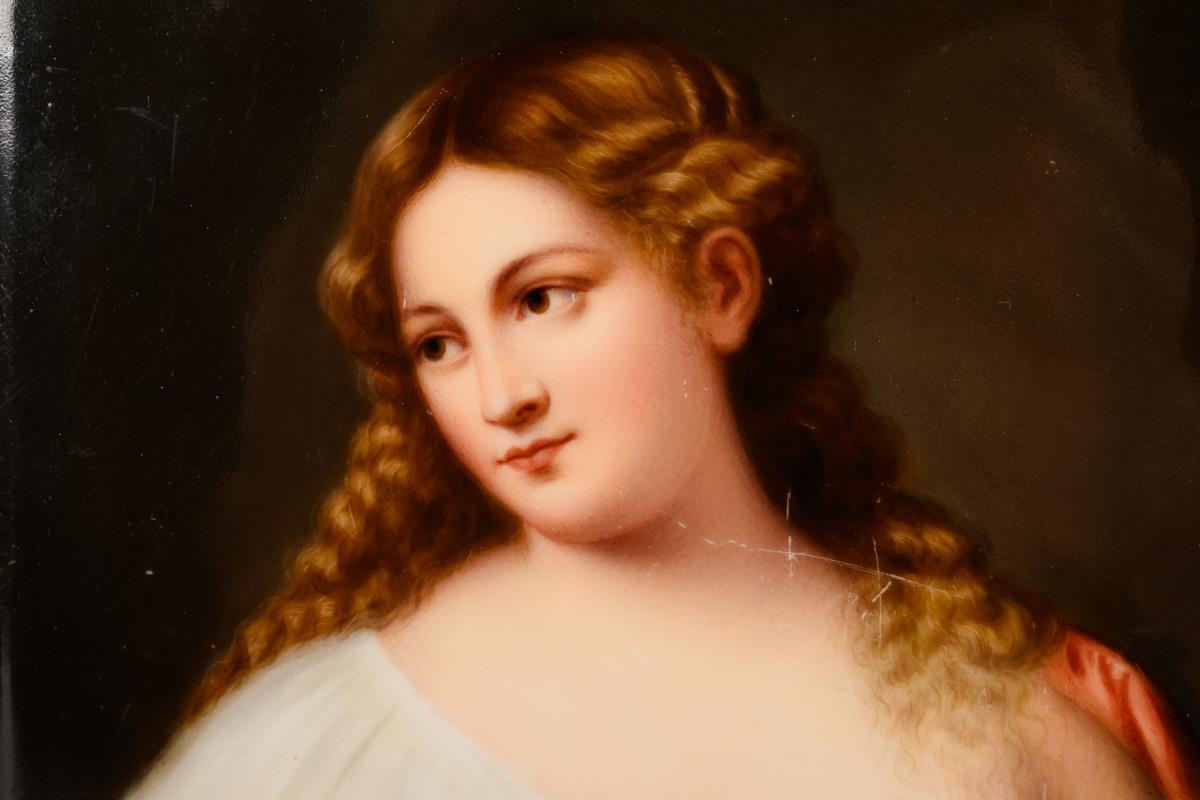 Rectangular panel with the depiction of a young woman in a white robe, holding flowers in her right hand, after a painting by Titian (1490-1576). Scratches in the image.