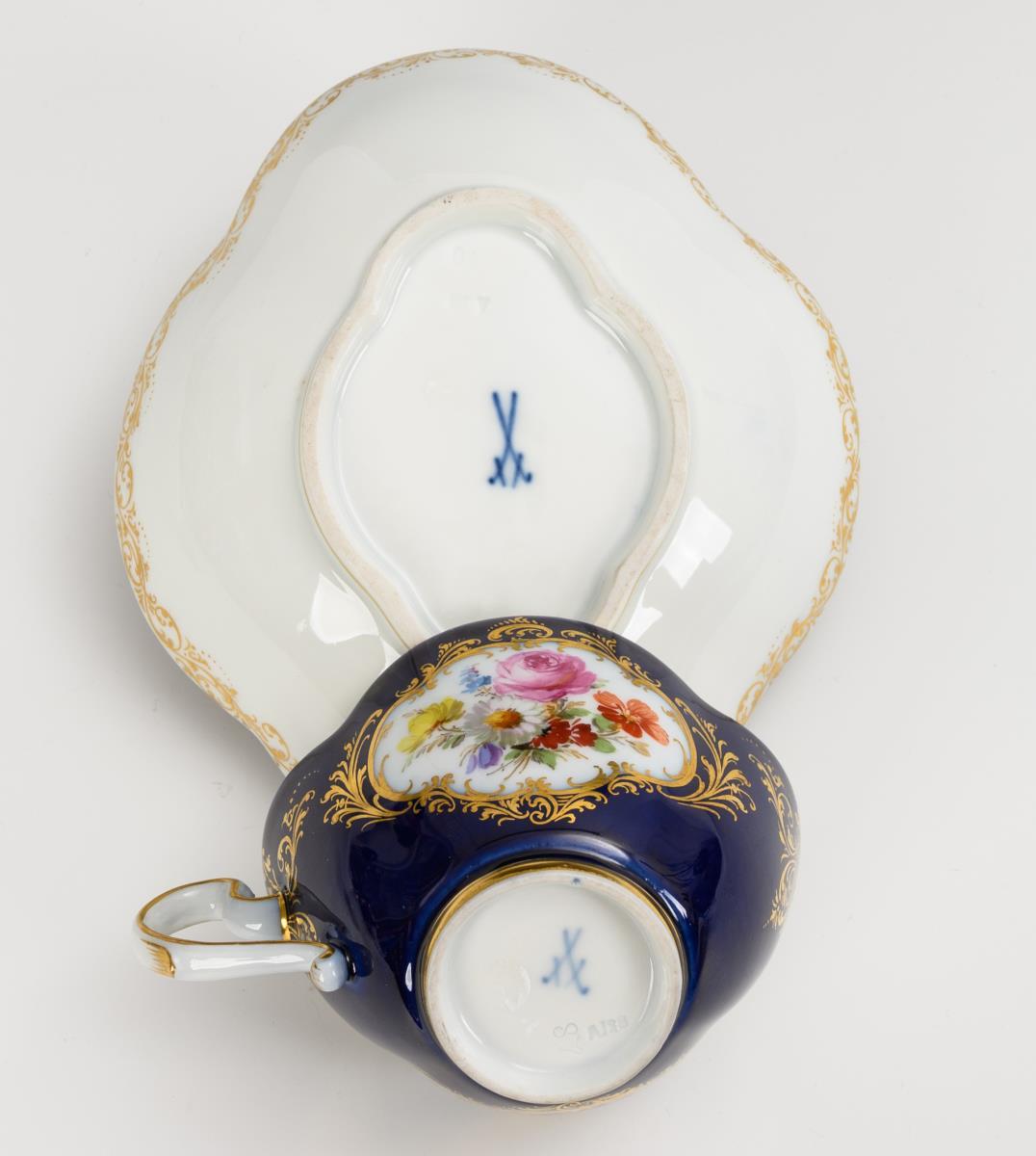 Cobalt blue ground, polychrome painting, gold staffage. Cup (h 5 cm), original saucer (l 13.5 cm).