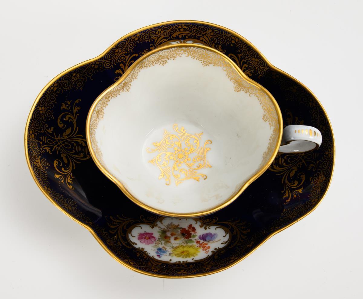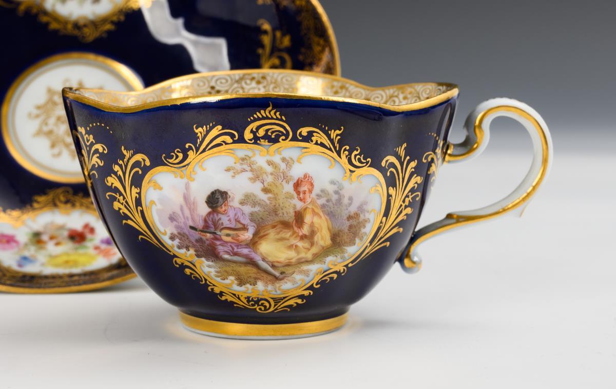 Cobalt ground with rich floral-ornamental gold painting, on the front of the cup a quatrefoil cartouche depicting a gallant scene, on the reverse a bouquet of flowers.